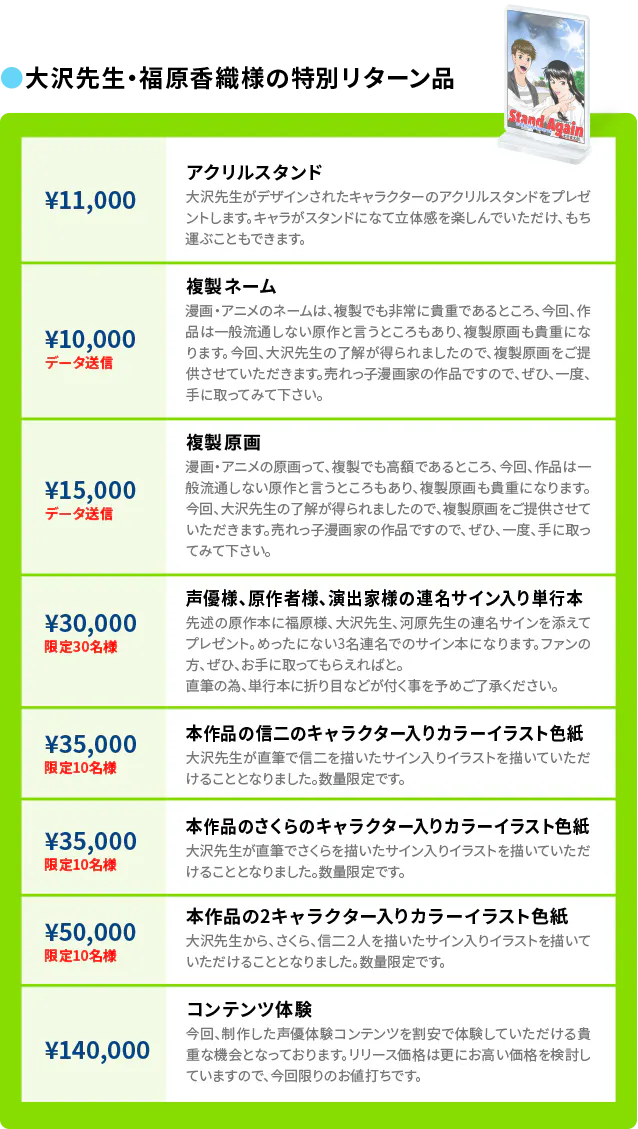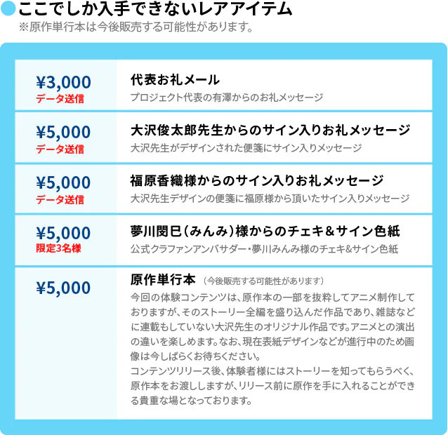 大沢先生・福原香織様の本プロジェクトにご用意された特別リターン品