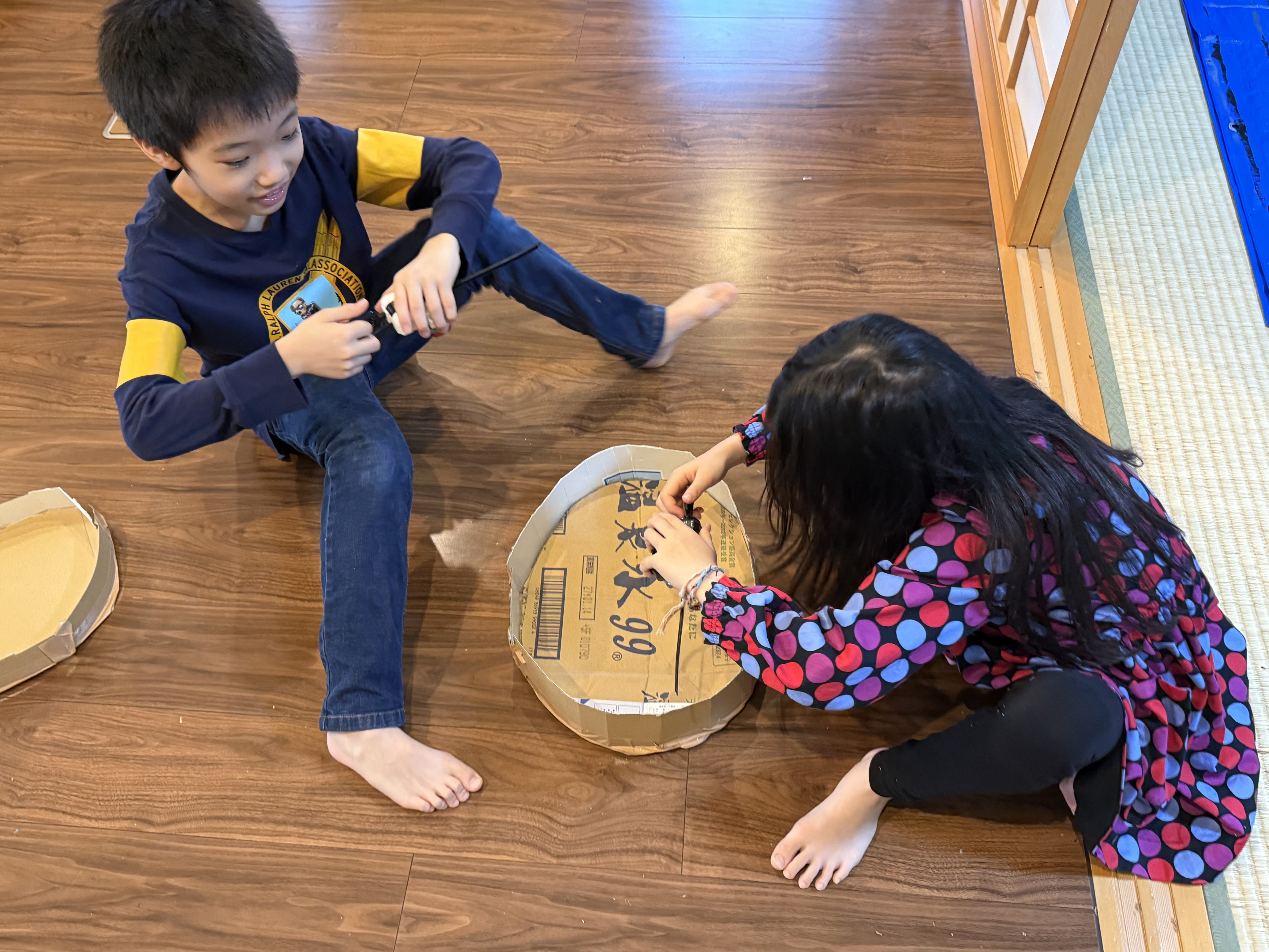 すると…2人は段ボールで手作りスタジアムを作って遊び始めました!
