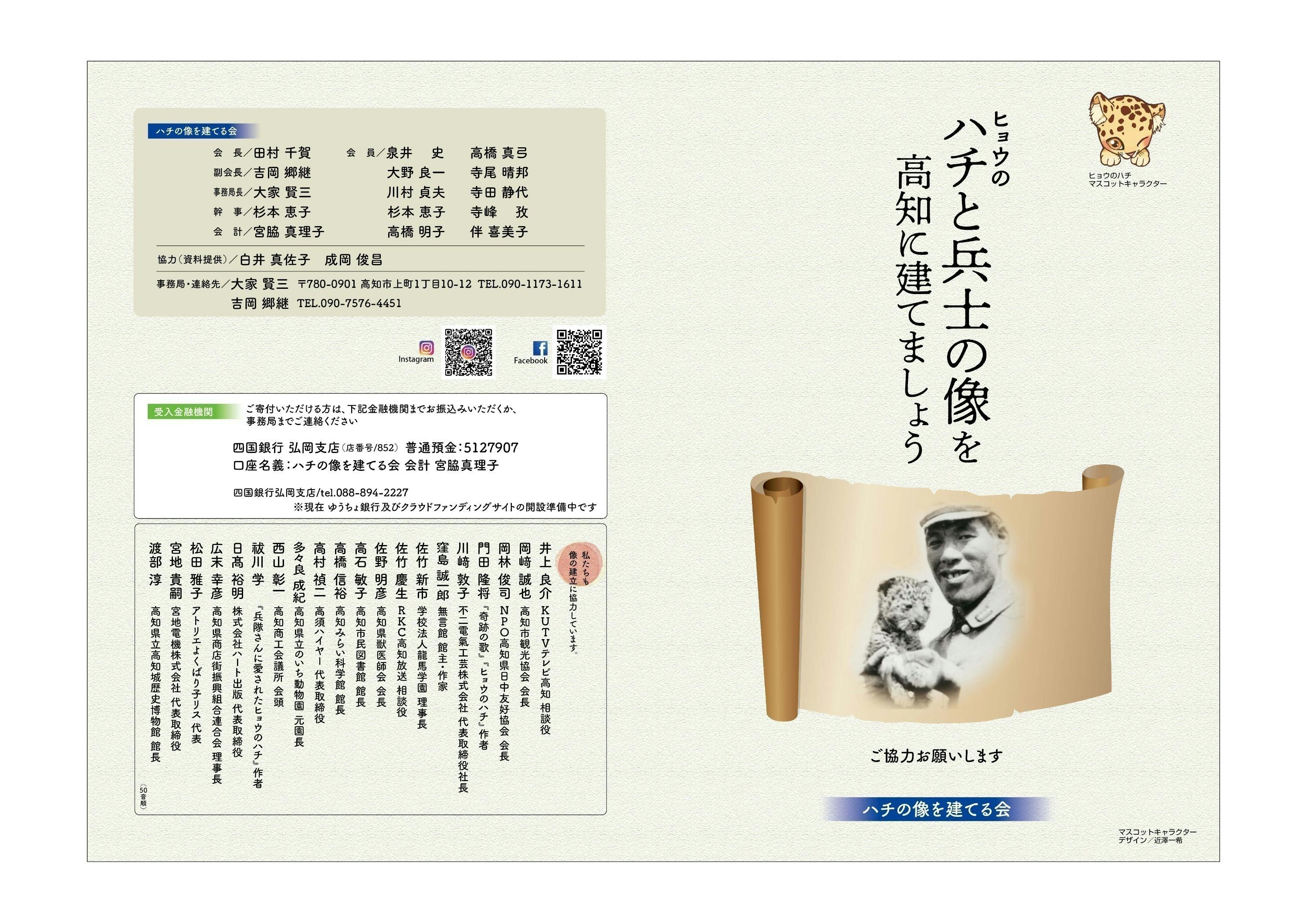 2025/05/27 13:455/25に、日曜市にハチのブースを出させて頂きました。雨上がりの青空。清々しい風の吹く中、いろんな方に声をかけていただきました。そっと募金箱に入れてくださる方、興味をもって覗きに来てくださる方、ヒョウのハチのお話しっちゅうよと話してくださる方、この第八部隊の方の親戚ですと応援に駆けつけてくださったり、本当にたくさんの方がハチと成岡さんの像に思いをよせてくださいました。感謝ばかりです。 もっと見る