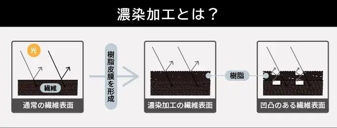 繊維表面がクレーター上になっている樹脂皮膜を形成し、反射率を抑え濃色効果を発揮。加えて繊維上にも凹凸を作り上げ、更に深みのある黒を表現しております。
