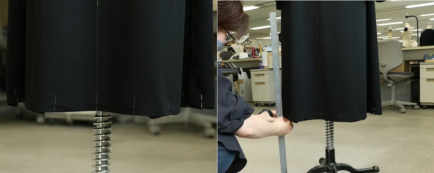 ご支援者の皆様当プロジェクトをご支援頂き誠にありがとうございます。前回に引き続き、「たためるフォーマル」のモノ作りについてご紹介をさせて頂きます。本日は「綺麗なシルエットを生み出す裾まわりのパターン」についてです。前回のレポートでも書かせて頂きましたが、ストレッチ性のある素材を使用して「きちんと感」のあるシルエットを表現するには、細かな修正が必要であり、それは裾まわりの仕上がりも例外ではありません。「たためるフォーマル」のように、裾にたっぷりと分量を使ったデザインでストレッチ素材を使用しますと、商品が仕上がった際に特定の箇所で生地の伸縮に違いが出ることがあり、同じ寸法作っても、製品が仕上がった時に裾がフラットにならないケースがよくあります。裾のラインをフラットにキープするためには、生地の若干の伸縮の違いをあらかじめ予想して、パターンを作成する時点で伸縮を加味した長さに修正して、パターンを作り上げていきます。一度組んだパターンで生地を当て、床からの長さを随時チェックしながら、箇所ごとに寸法を決定していきます。(こちらもミリ単位の作業となります)こうすることによって、着用時にきちんと感のあるフラットな裾まわりのシルエットが完成し、フォーマル感をしっかりと表現することが可能となります。以上、きれいな裾まわりのシルエットを表現する作業のご紹介でした。私たち東京ソワールは、フォーマルウェアを取り合う企業として完成度を最大限高めた商品をお届けする責任を持ちながら、日々モノ作りに励んでおります。今回のプロジェクトが、我々のこの想いを知っていただく機会となれば、非常に嬉しく思います。引き続きご愛顧のほど、宜しくお願い致します。