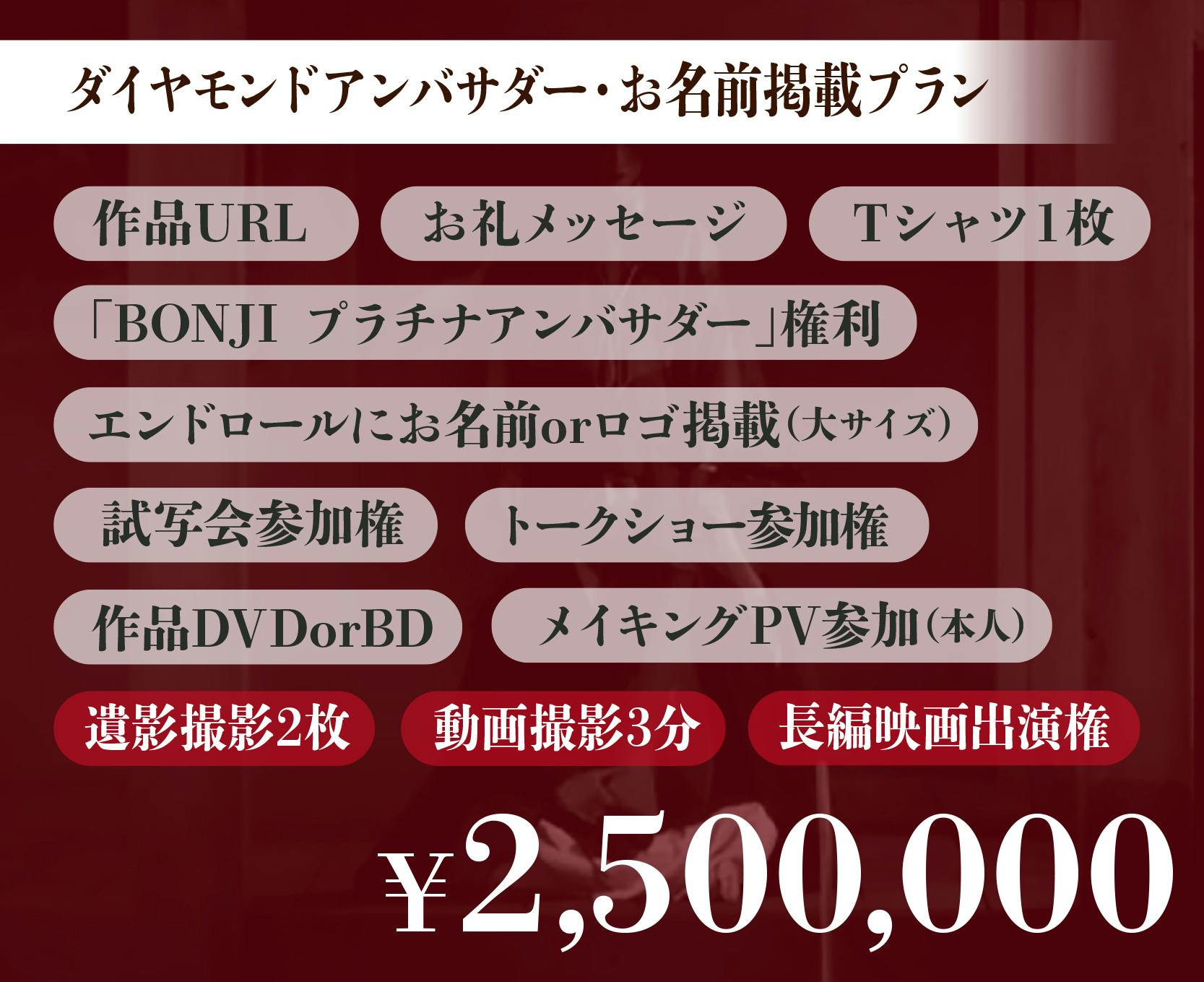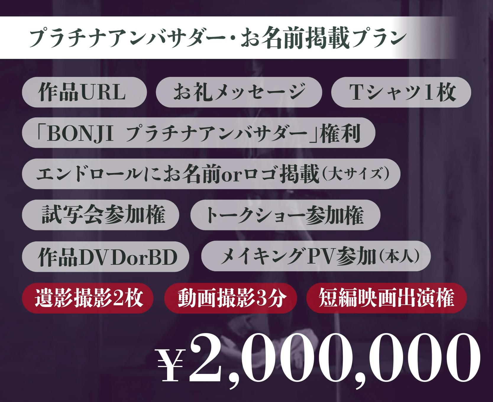 「BONJI INFINITY」は、現代とは相反する真逆な体質の映画、目に残る映画、人によって全く解釈が変わってしまう映画だと思います。繰り返しますが、この作品はとても実験的な映画であり、日本映画ではビジネスの対象外となる映画です。日本の配給対象となる映画ではないだけに、皆様のご理解とご協力を頂き、国際的に評価を受けられるよう海外の映画祭に出品する予定です。