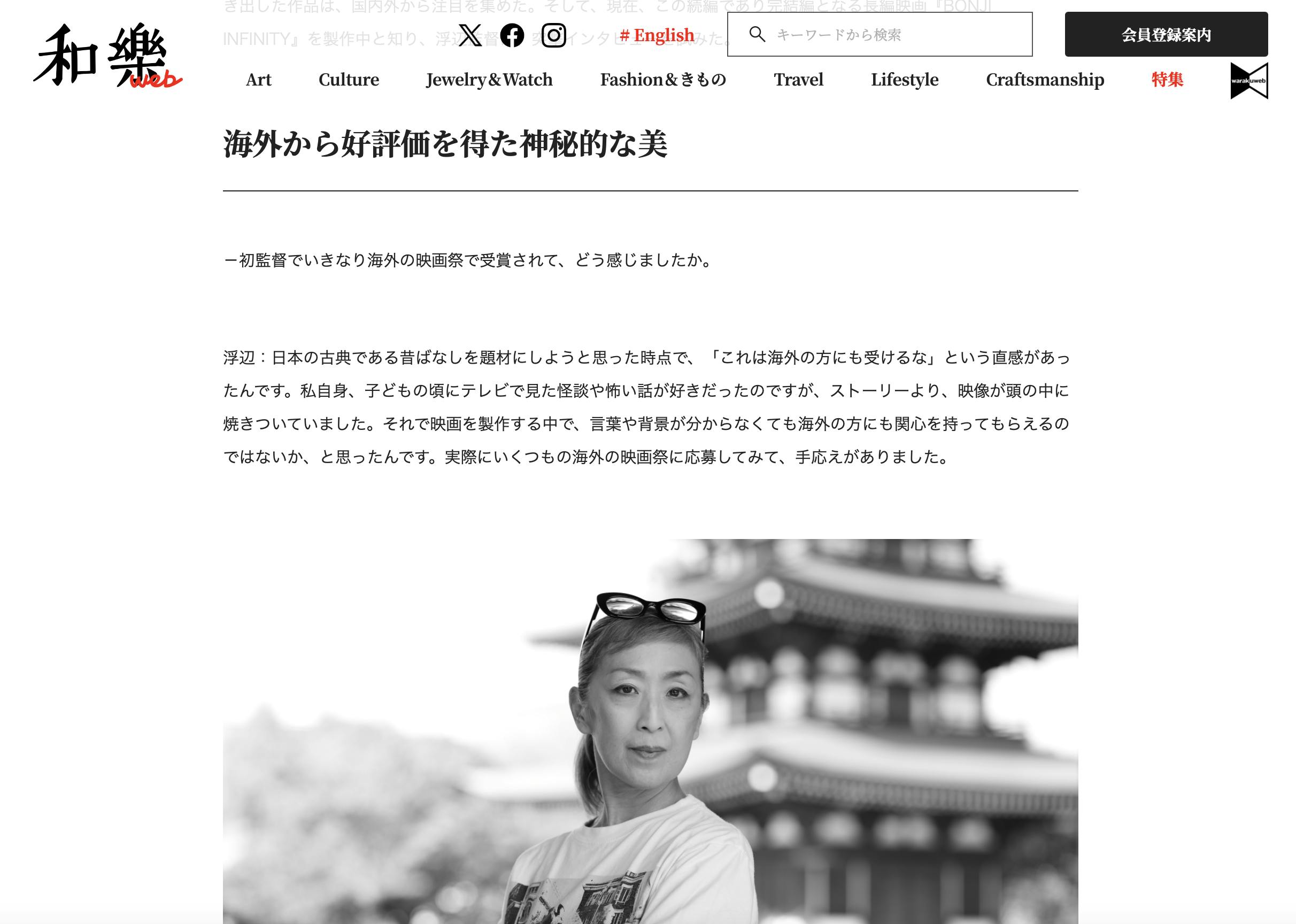 2025/05/29 12:27和樂webに浮辺奈生子監督のインタビューが掲載されています。本人の即席、この作品を作ることになった背景、新作に対する思いなどが詳しく綴られています。記事リンク↓和樂web 覗き見ずにはいられない「日本の怪談」が世界を震わせた。モナコ国際映画祭W受賞『梵字 BONJI』制作秘話 もっと見る