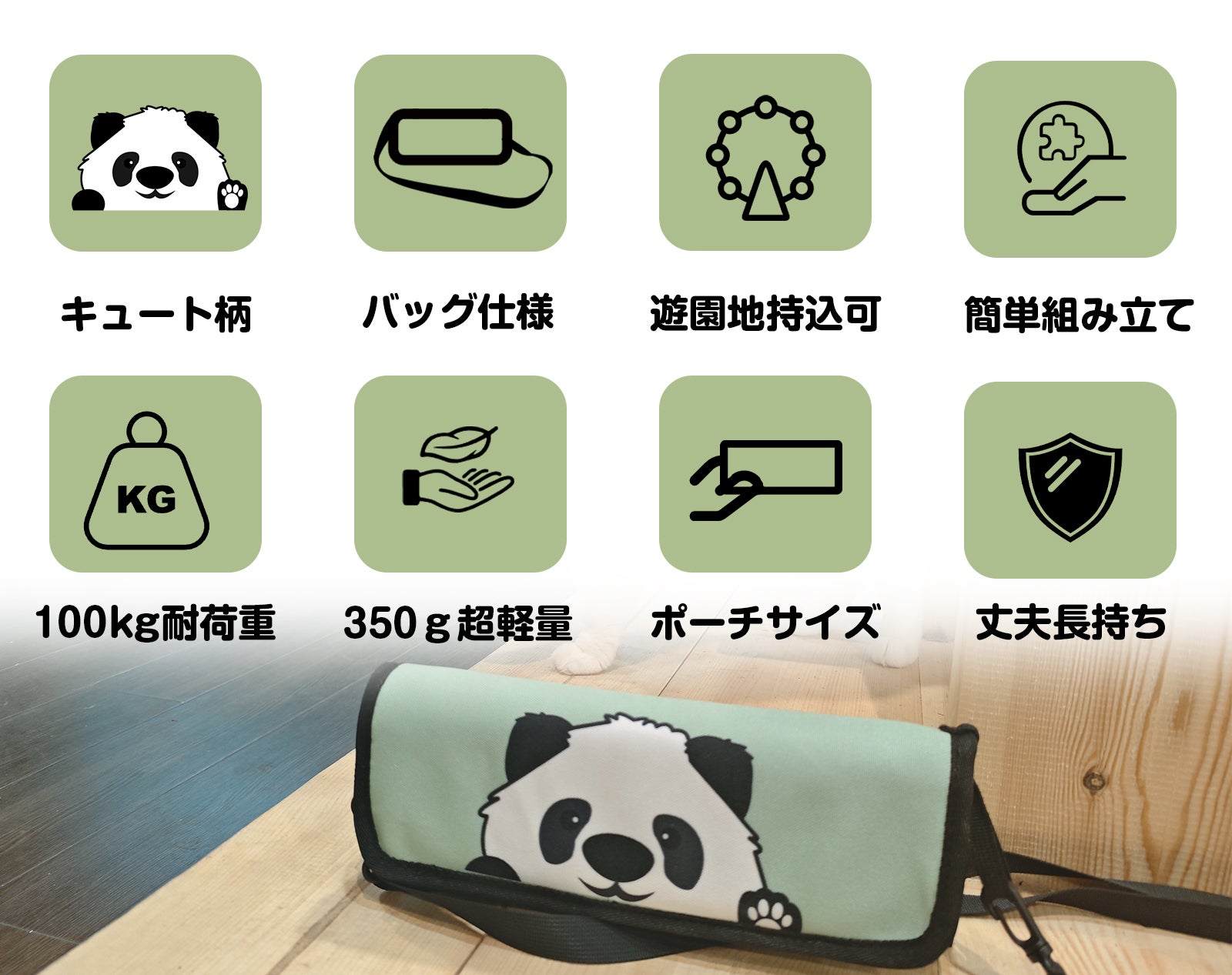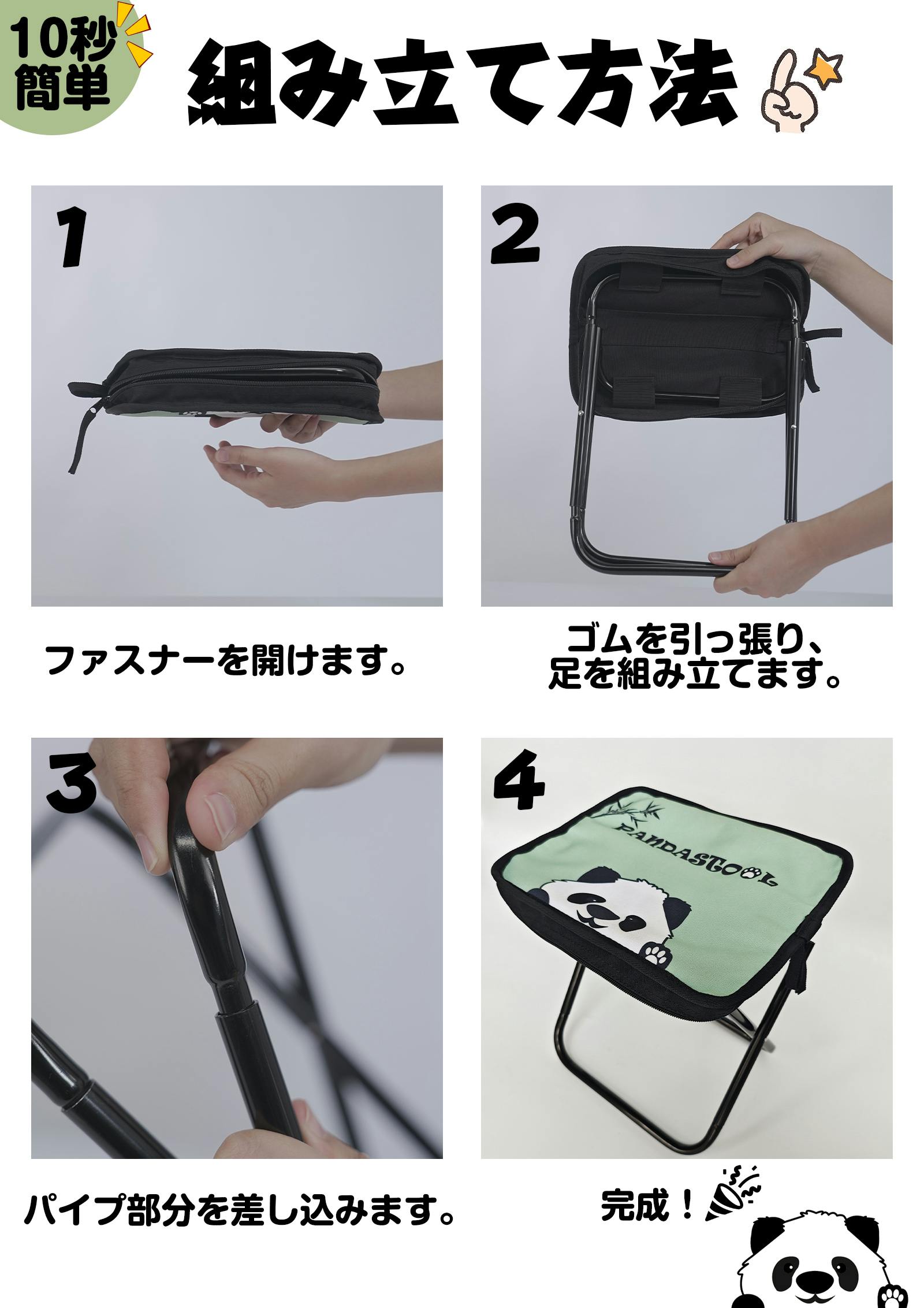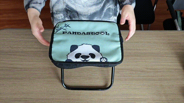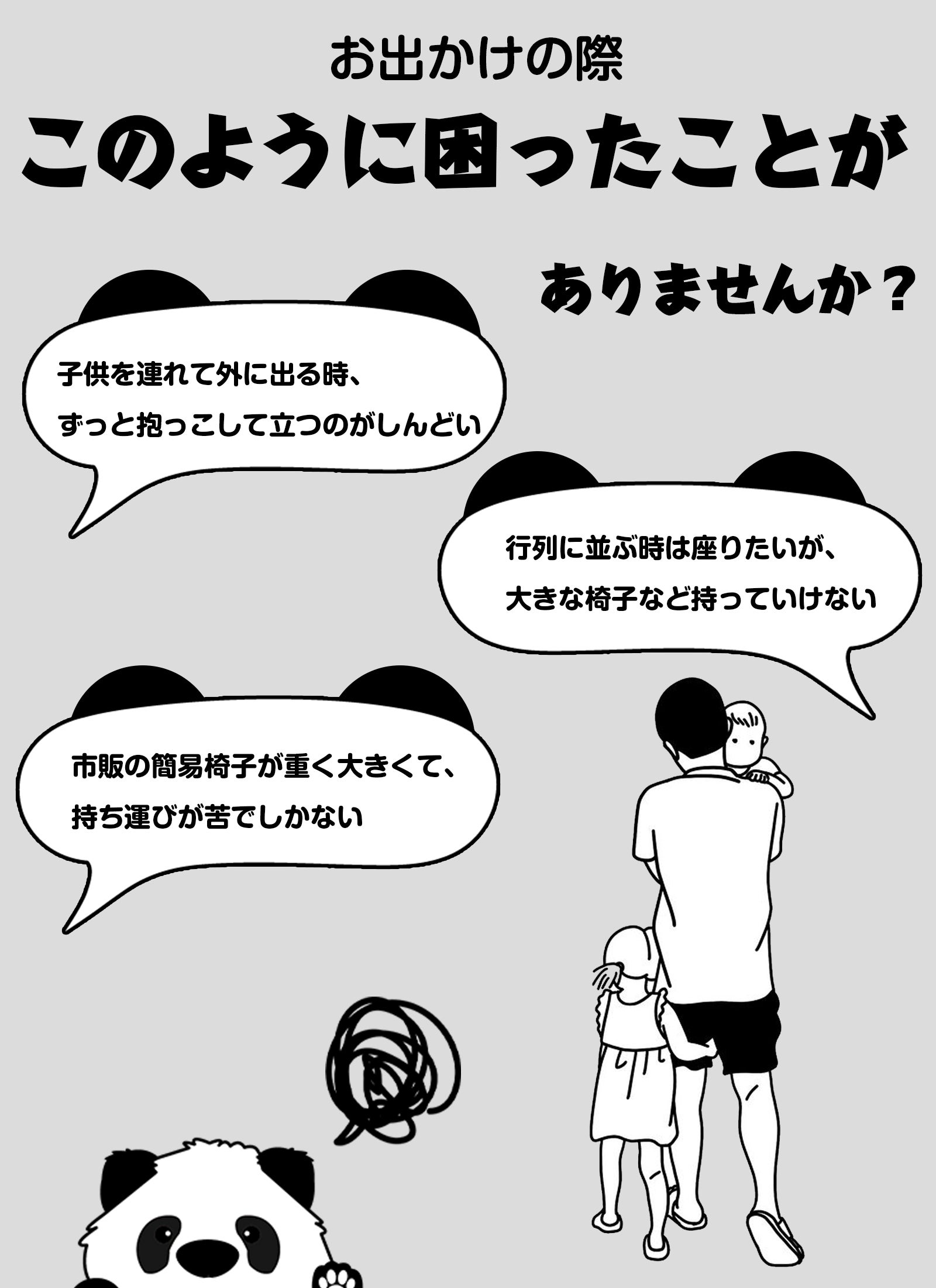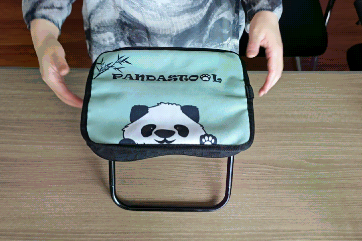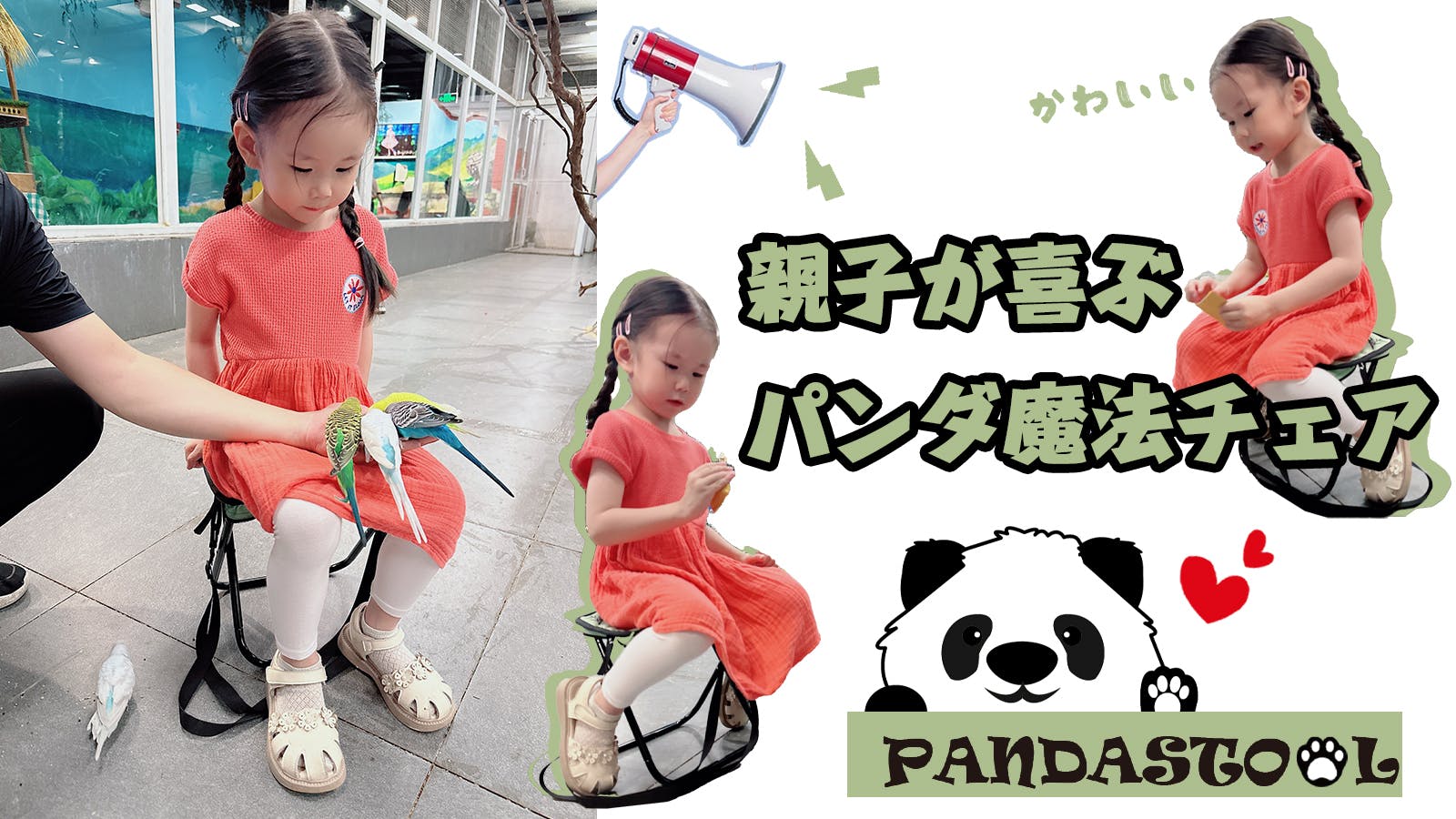 パンダ折り畳みチェアが子育てパパとママを応援します!お子さんを抱っこして手が空いていない時は、バッグとして掛けられます。忙しいパパとママの負担を減らします。