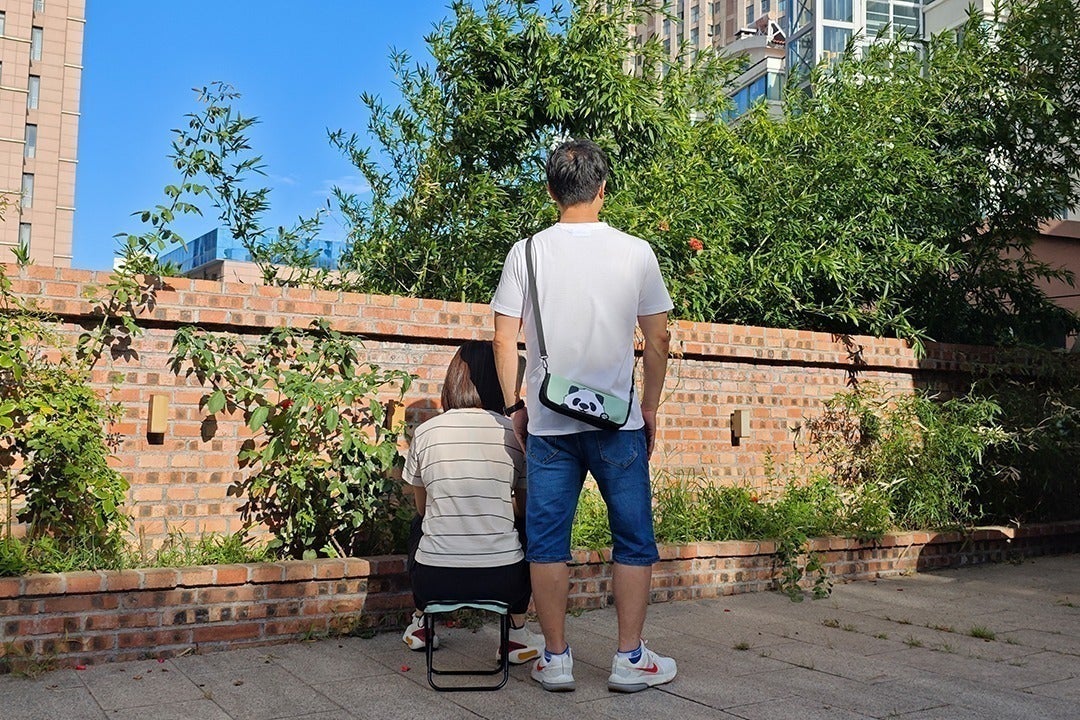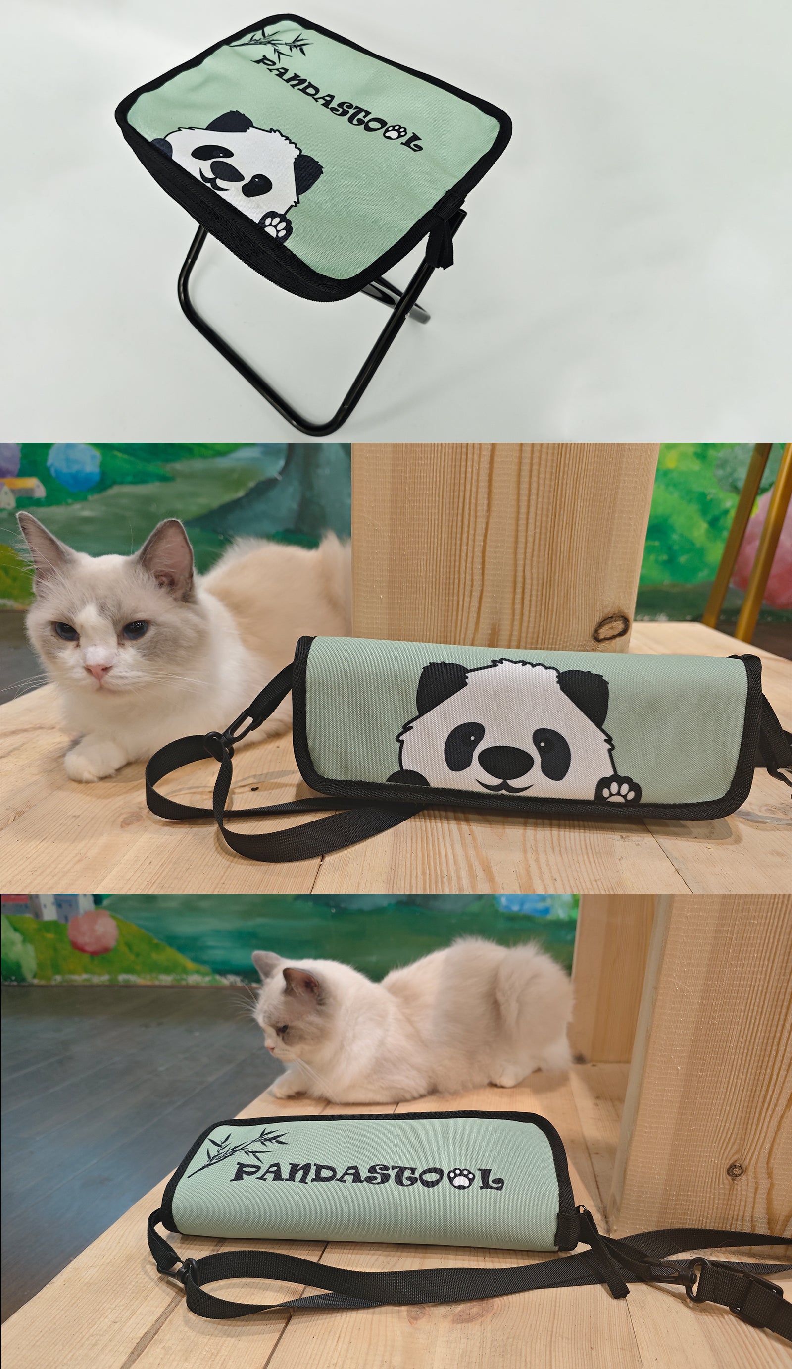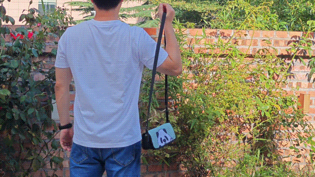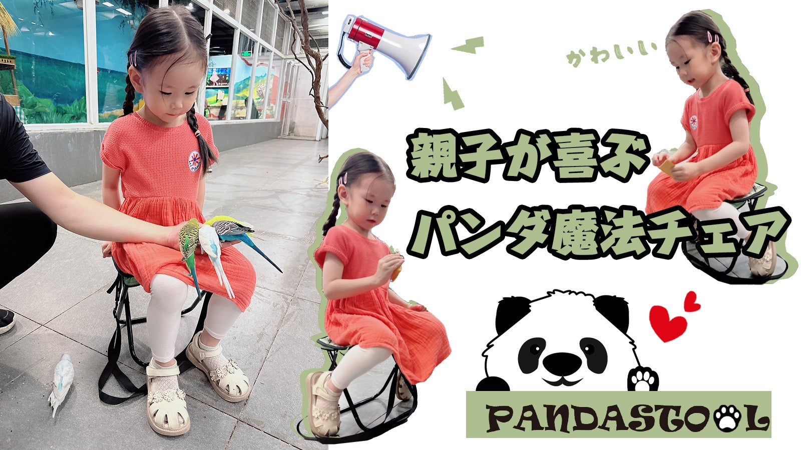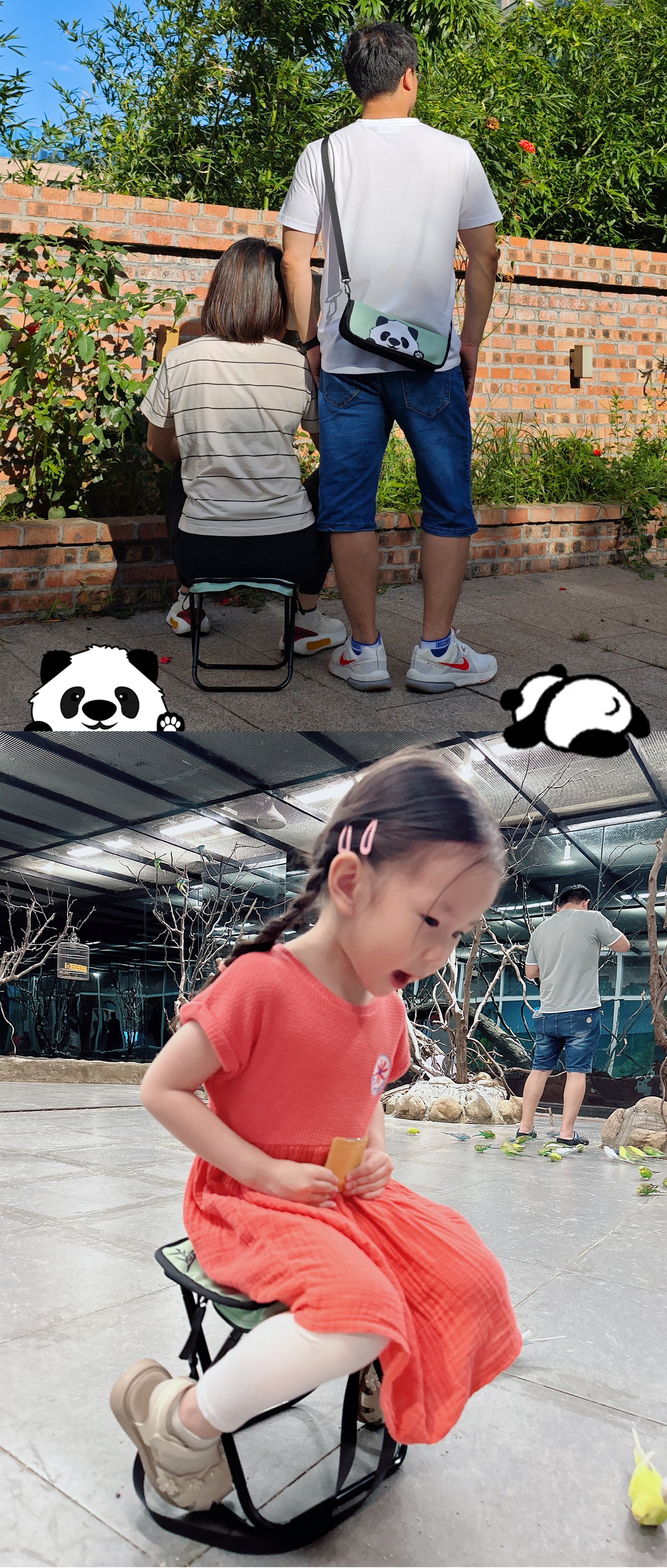 パンダ折り畳みチェアが子育てパパとママを応援します!お子さんを抱っこして手が空いていない時は、バッグとして掛けられます。忙しいパパとママの負担を減らします。