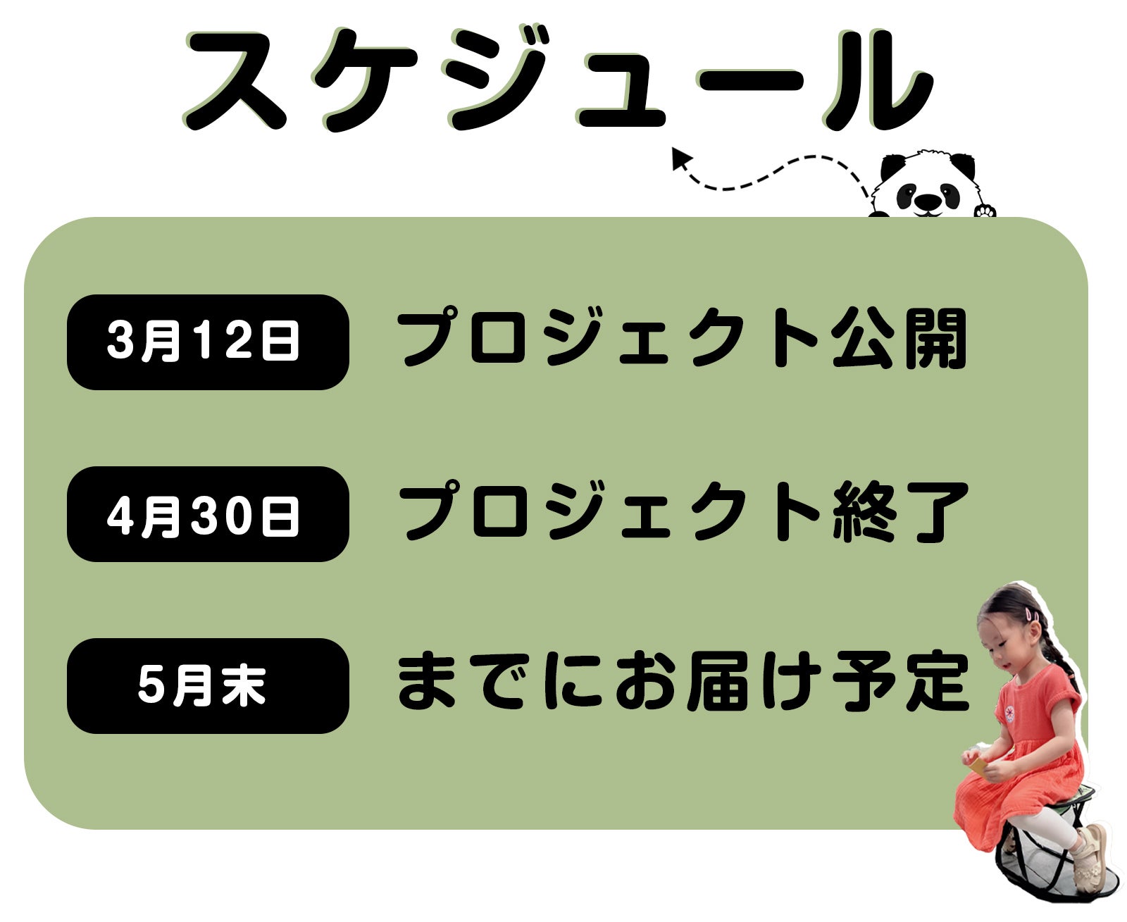 子育てで忙しい親御さんや日々頑張っている方を応援しようと、パンダ折り畳みチェアの開発に取り組みました。可愛いデザインが皆様の日常を彩り、便利な仕組みが休憩したい時の心強いパートナーになればと願っております。