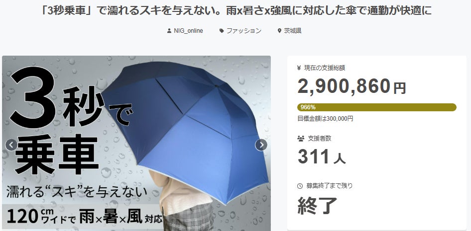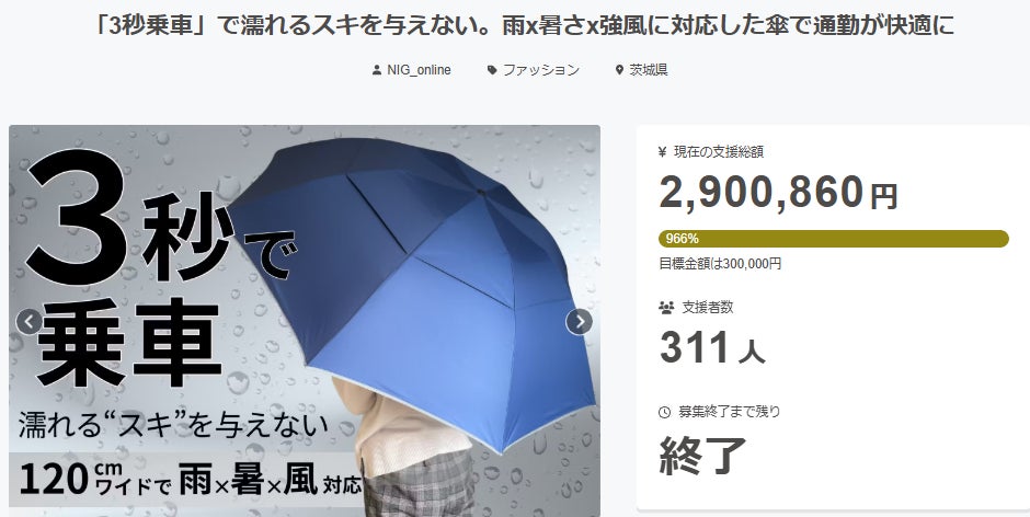 支援者のみなさまいつもプロジェクトの応援ありがとうございます。雨x暑さx強風に対応した傘~NJ27W~ プロジェクトが昨日終了しました。支援総額:2,900,860円支援者数:311名と多くの方からご支援を頂きました。また多くの温かいコメントも寄せて頂き、本当にありがとうございました!!お手元に届くまで、お時間を頂戴し申し訳ありませんが、一日でも早くお届けできるよう準備しておりますので今しばらくお待ちください。発送状況につきましては随時活動レポートで報告させていただきます。※お届け予定時期までにお引越し等のご予定がある場合はお届け先の設定にご注意ください。引き続きどうぞよろしくお願いいたします。--------------------------------LINEで保証登録をしておくとお問い合わせやアフターサポートがスムーズに行えます。こちらのURLよりご登録ください。https://nigonline.com/nj27w-support-makuake--------------------------------