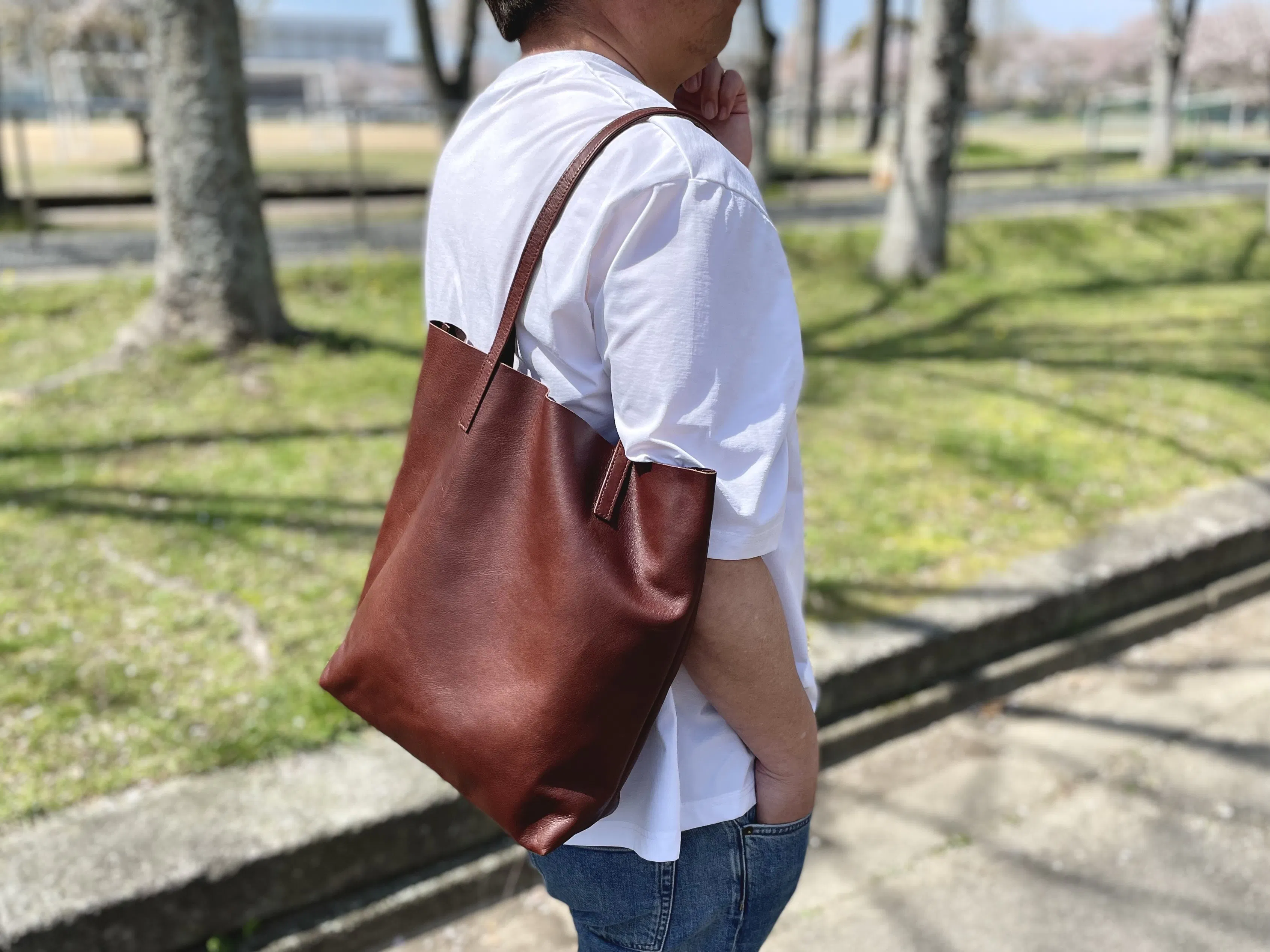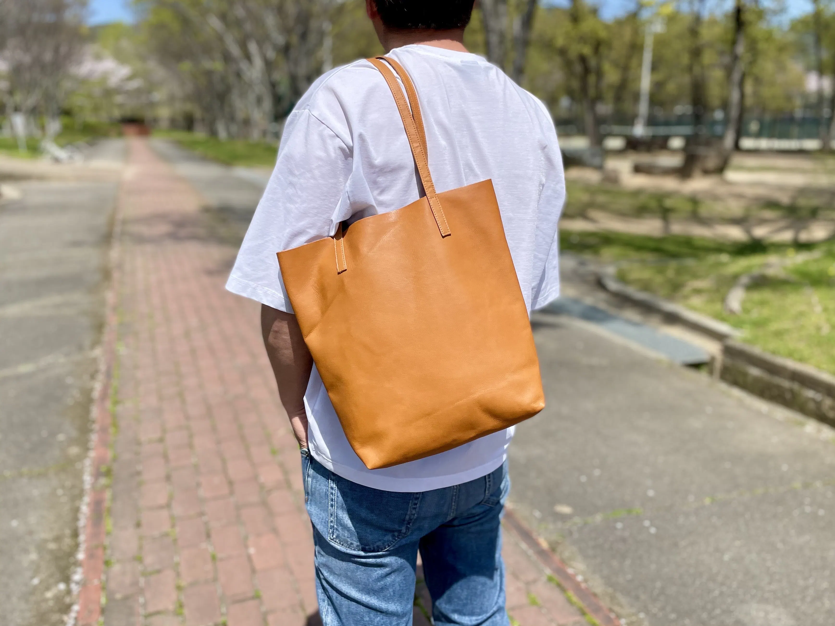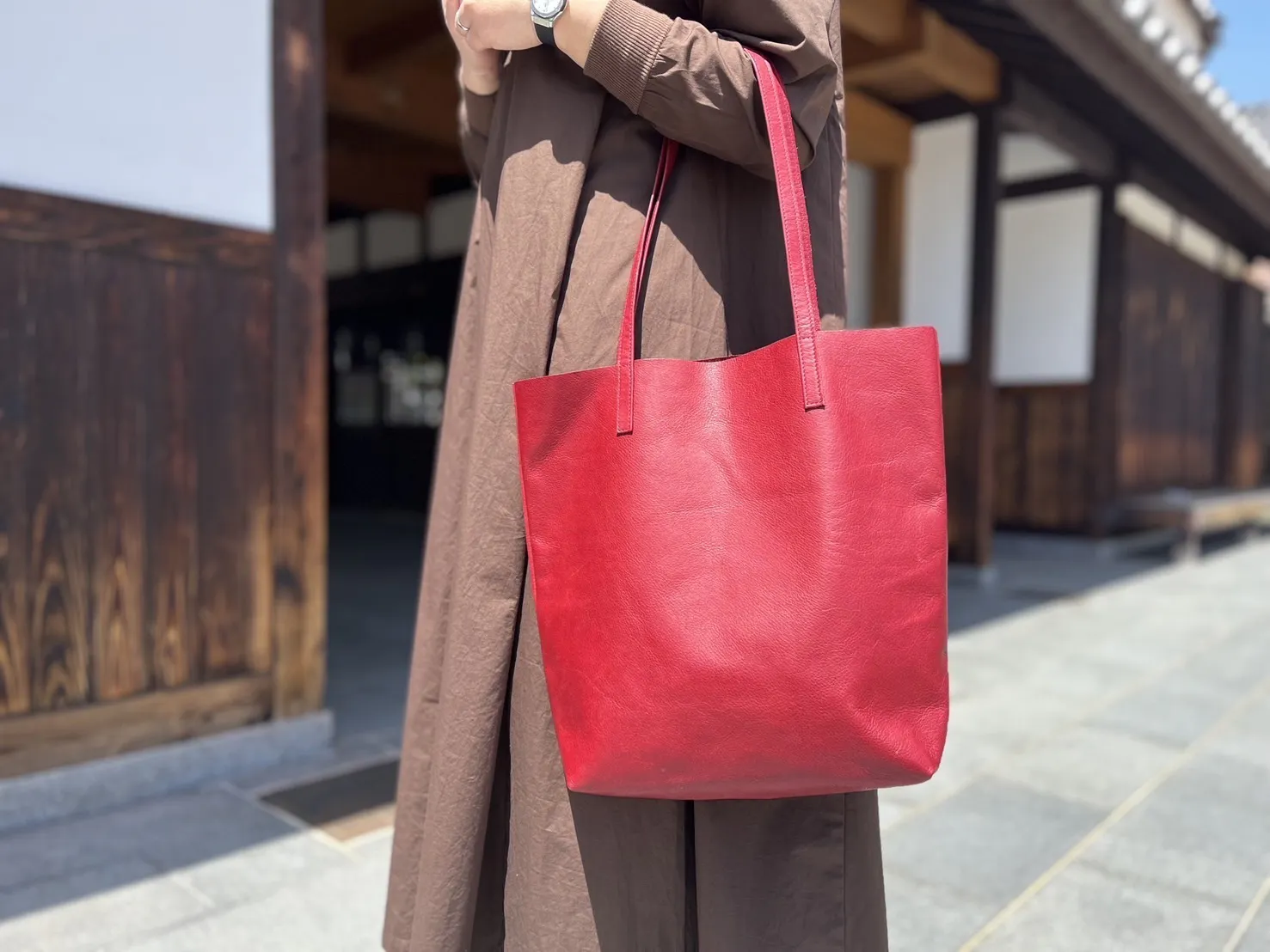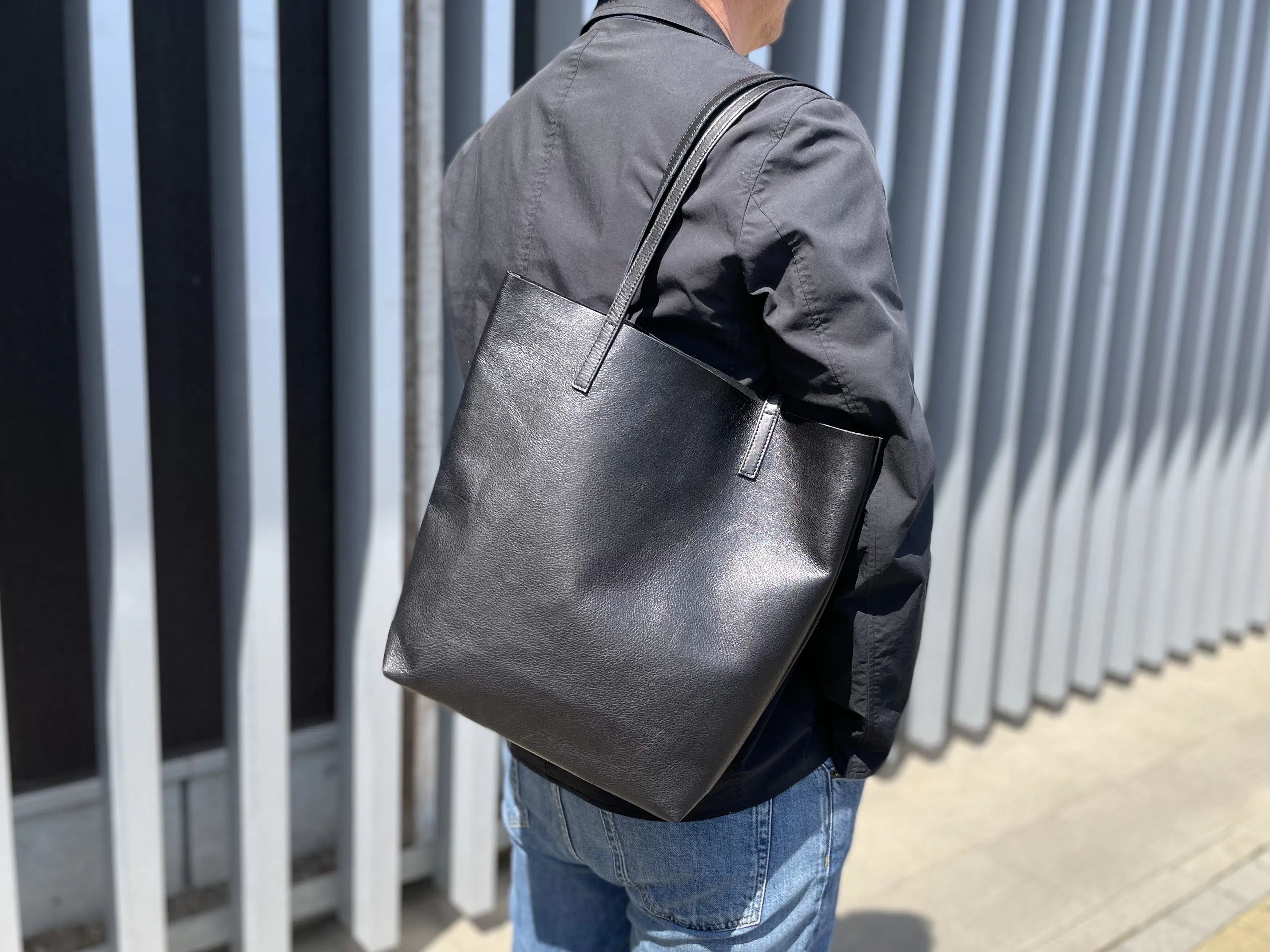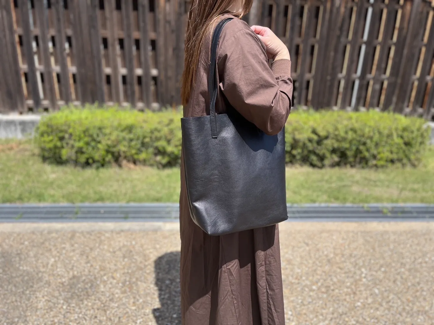 前回の軽ふわレザートートからサイズを見直し、今回は大きすぎず小さすぎずのスッキリ縦型にサイズ変更!お仕事の書類入れ〜普段使い、折り畳んでお買い物や旅行用のサブバッグと様々なシーンで活躍します。