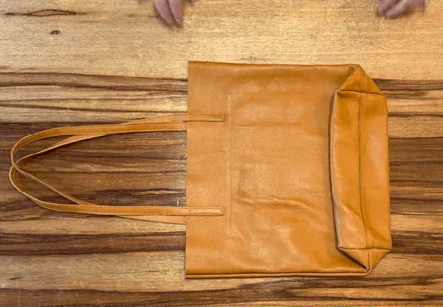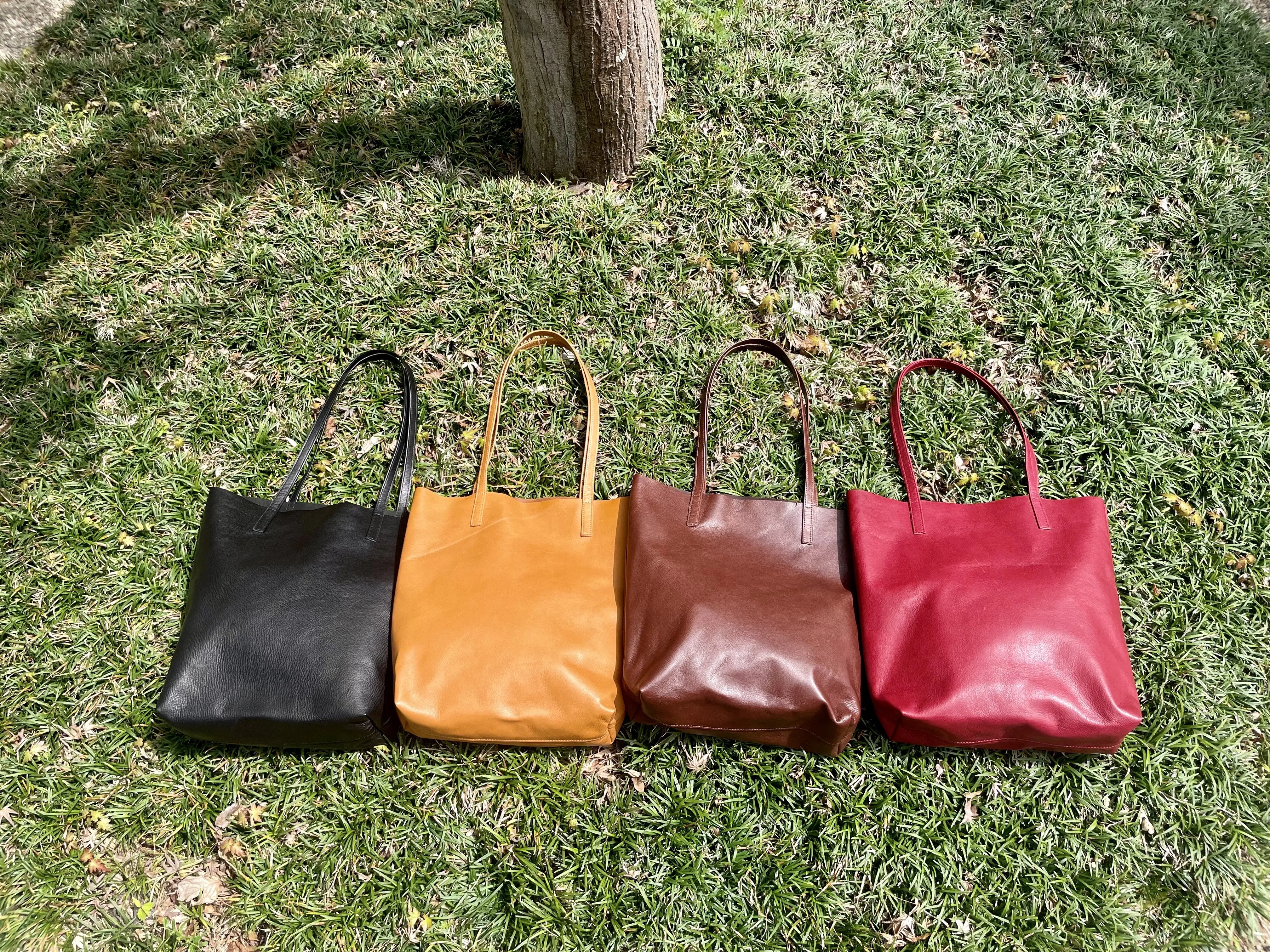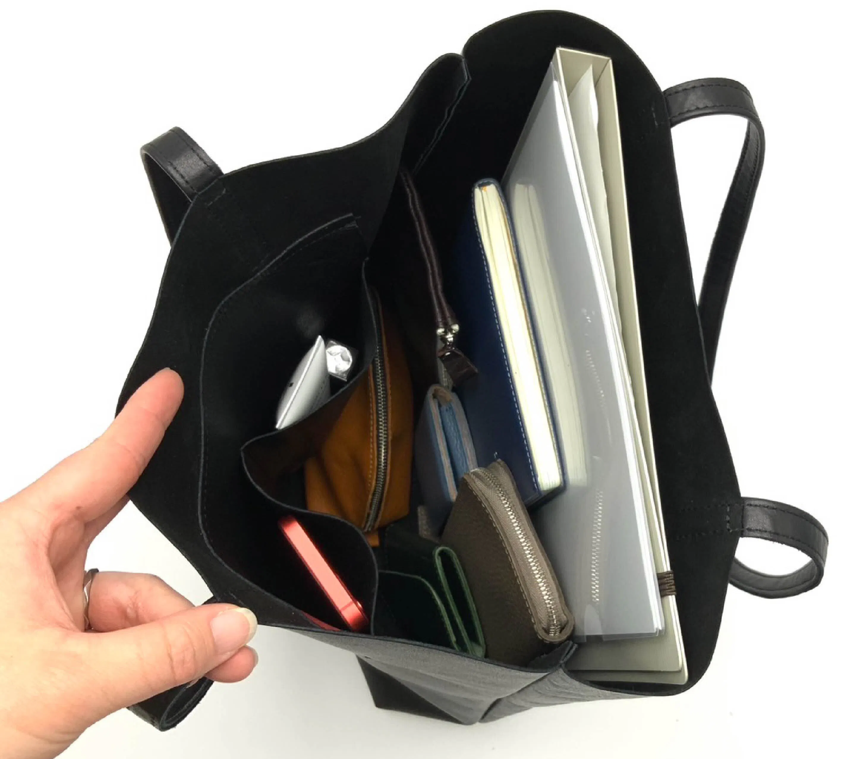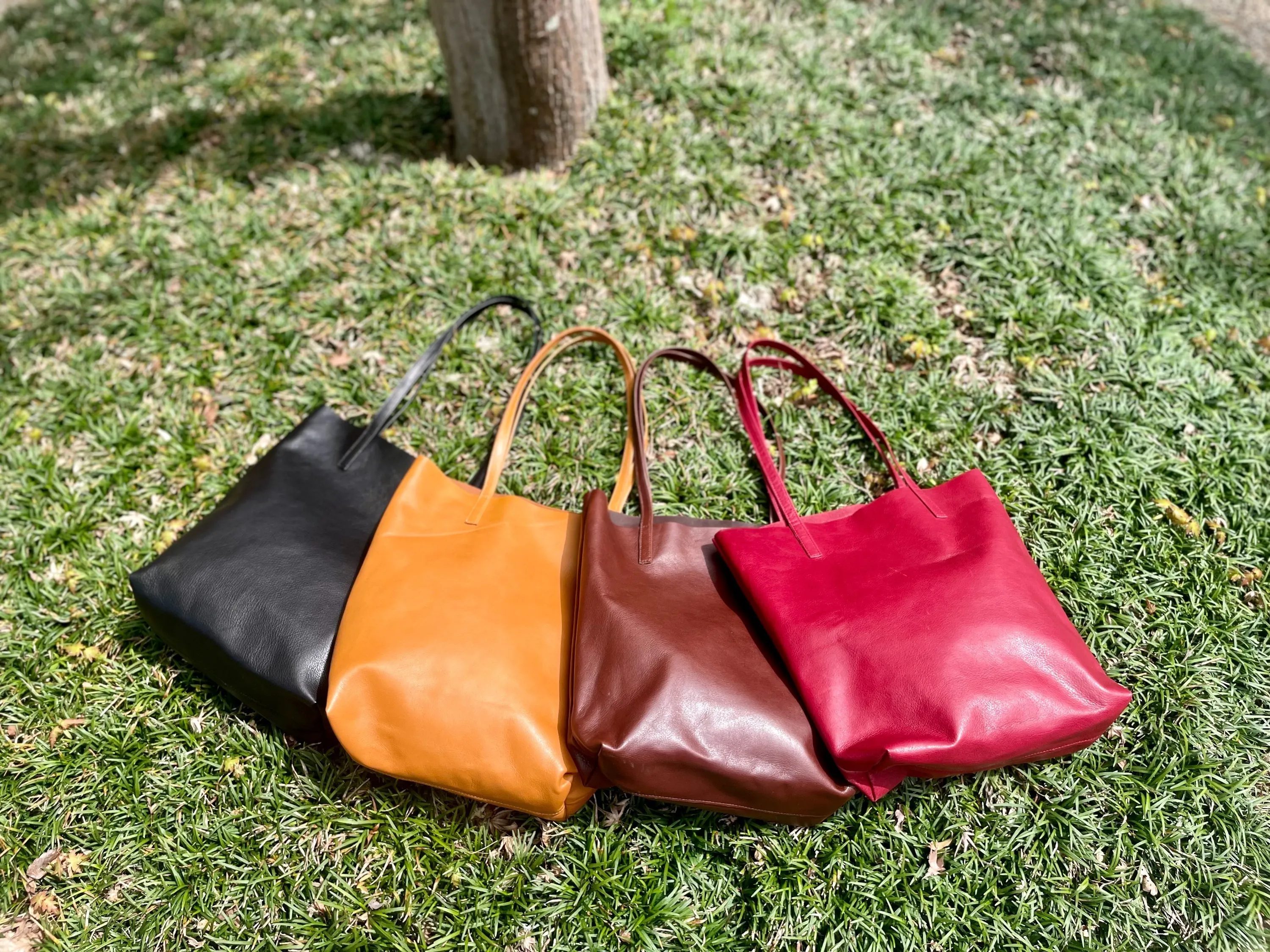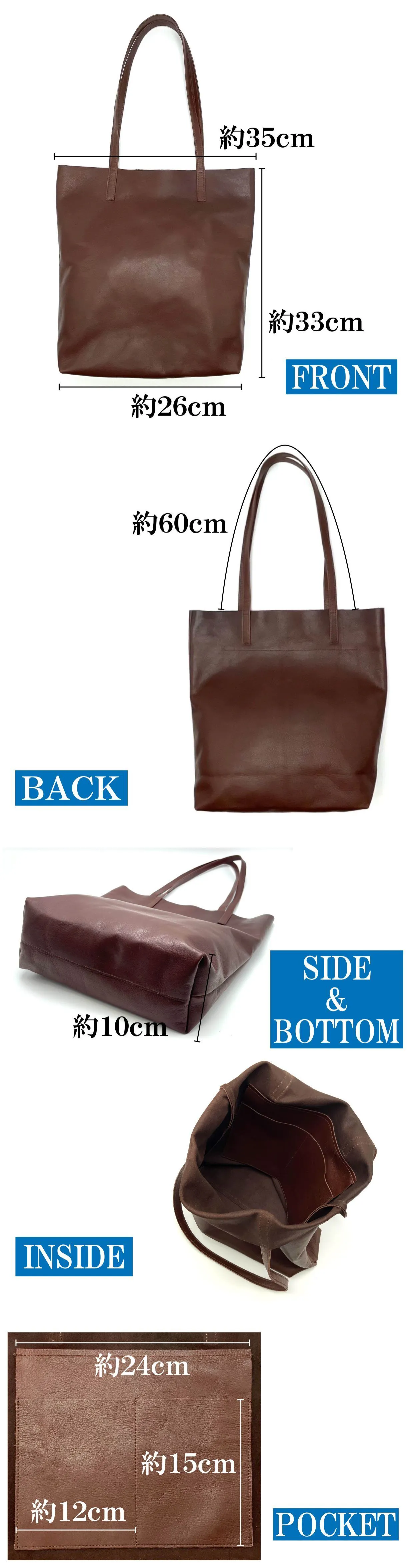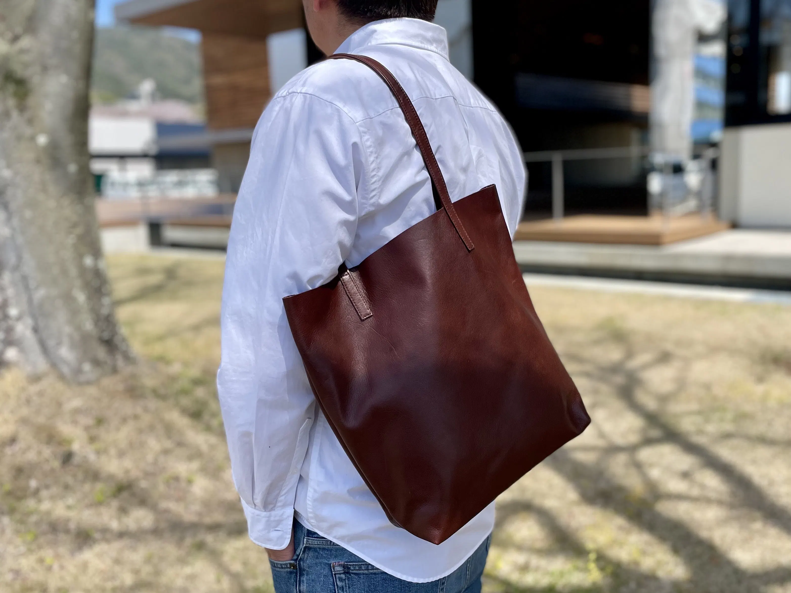 前回の軽ふわレザートートからサイズを見直し、今回は大きすぎず小さすぎずのスッキリ縦型にサイズ変更!お仕事の書類入れ〜普段使い、折り畳んでお買い物や旅行用のサブバッグと様々なシーンで活躍します。