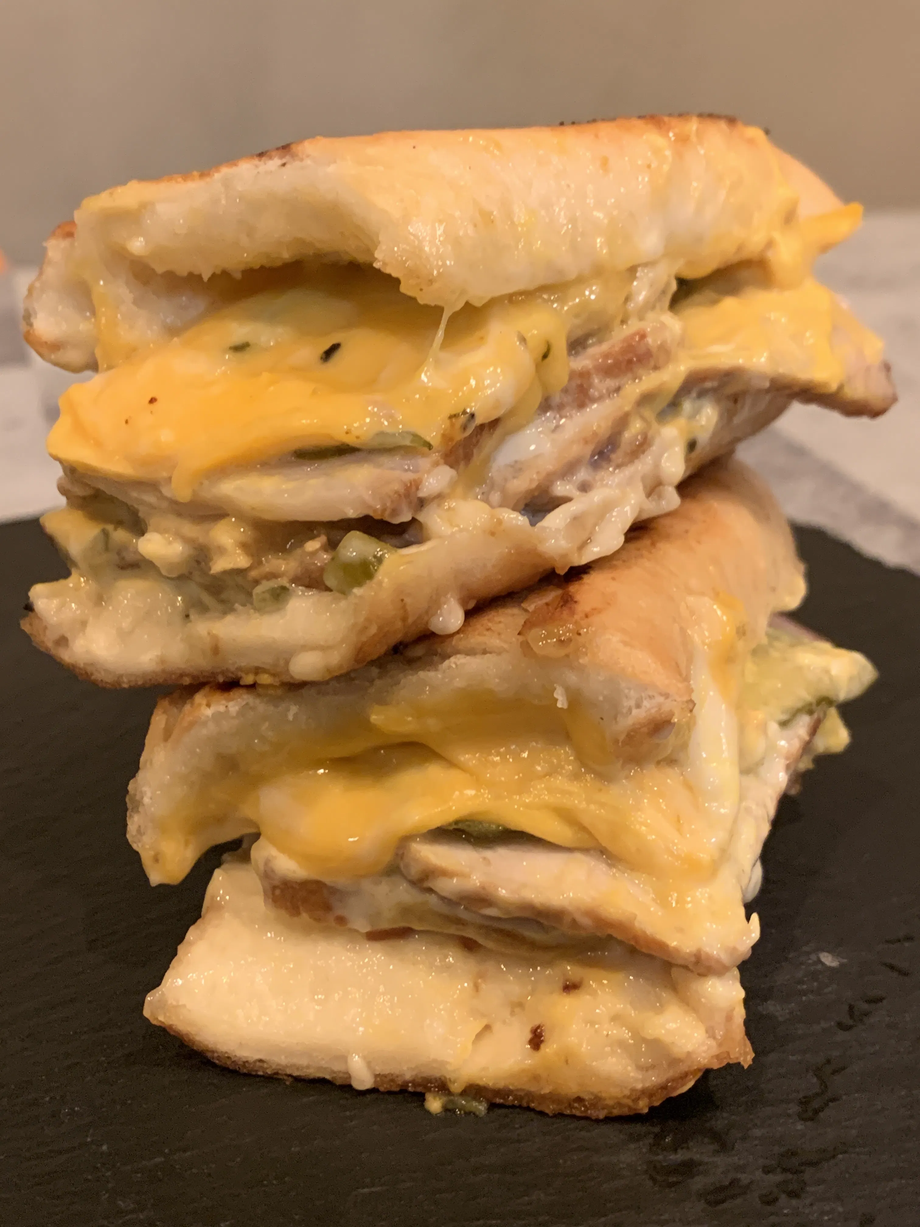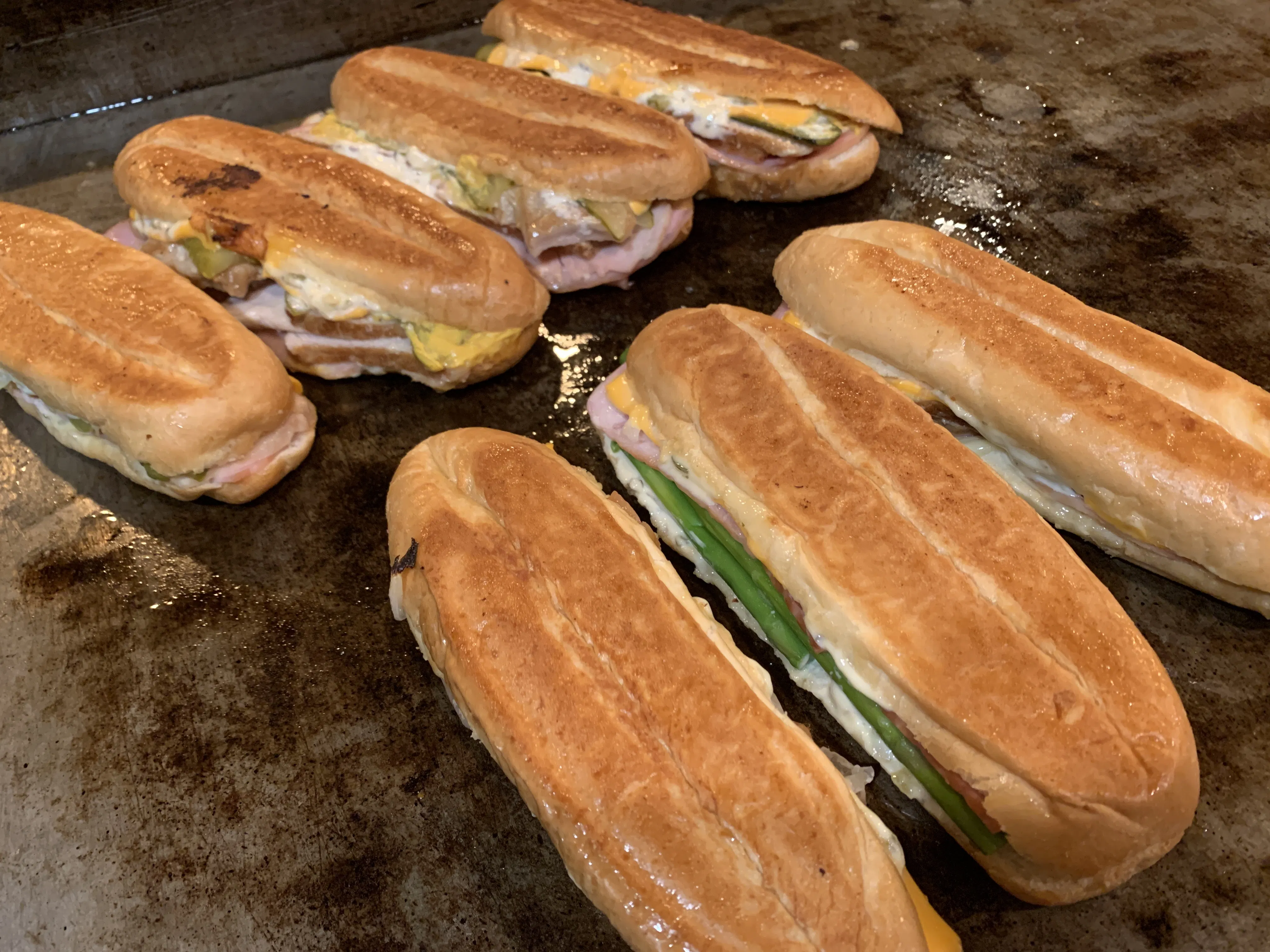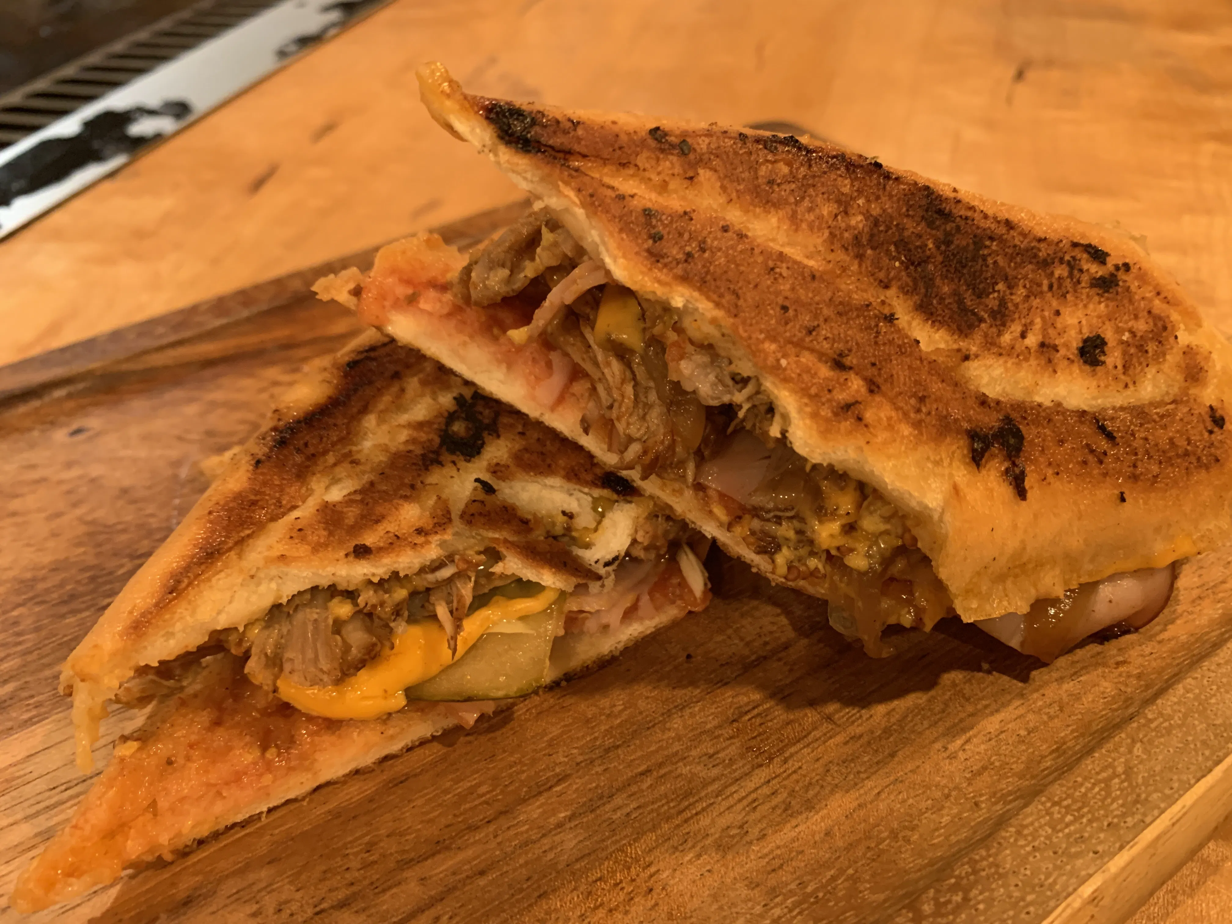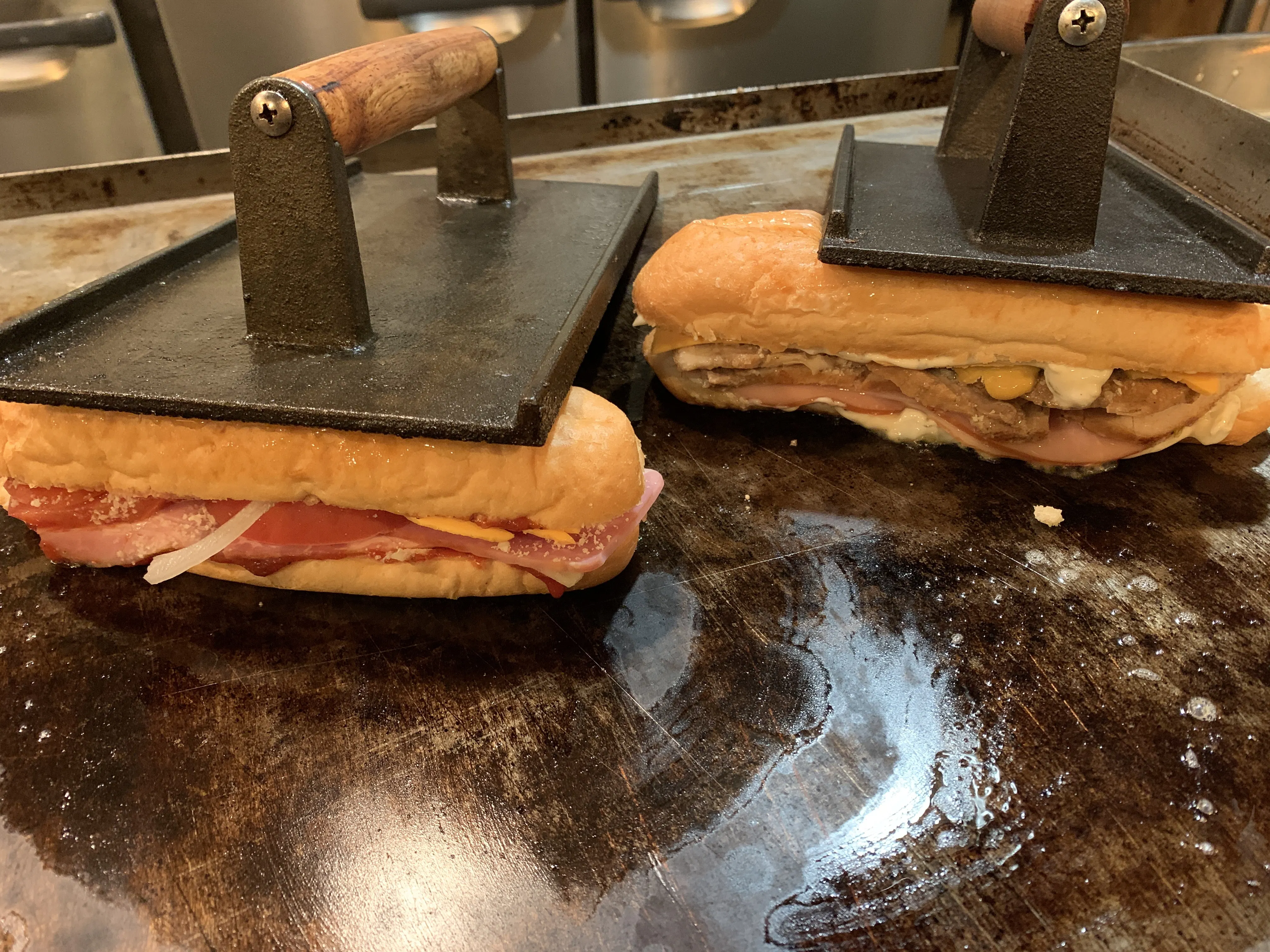 当店ではポークの表面を焼き、モホソースでじっくり煮込み一晩おいて味を染みこませ特性のピクルスソース・ハム・ピクルス・マスタード・チェダーチーズと挟み、パンにバターをたっぷり塗り鉄板でプレス焼き。パンはパリパリ・サクサク食感に!
