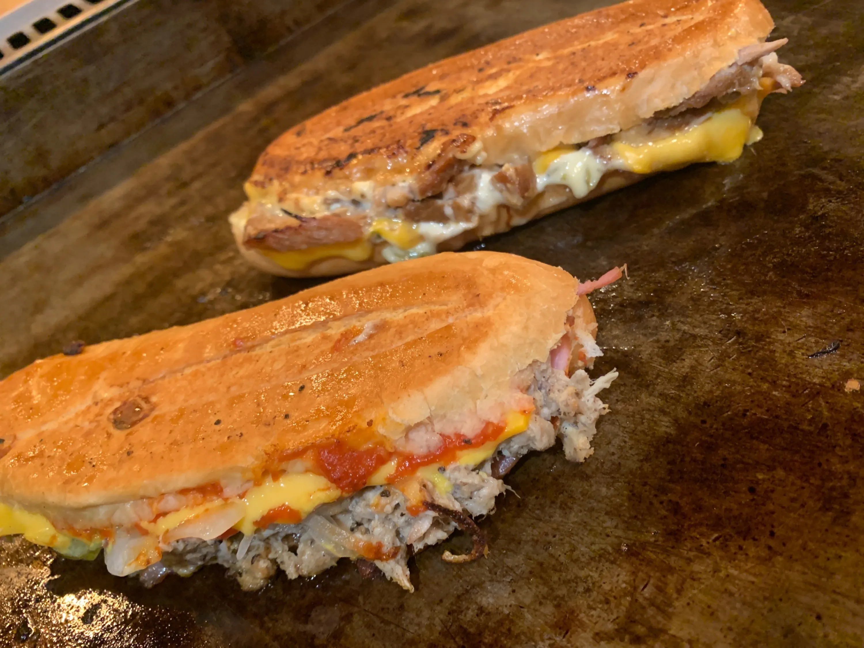 1800年代後半、キューバのスペインからの独立戦争時に戦火を逃れてアメリカ・フロリダ州に渡ったキューバ人が、アメリカのハム&チーズサンドウィッチに、故郷の味モホポークをプラスして誕生したのが「キューバサンド」と言われています。キューバと名前入っていますがジャンル的にはアメリカンフードになります。具材を挟んだパンにバターを塗り、鉄板でプレスして焼き上げるのがキューバサンドの特徴の一つです。