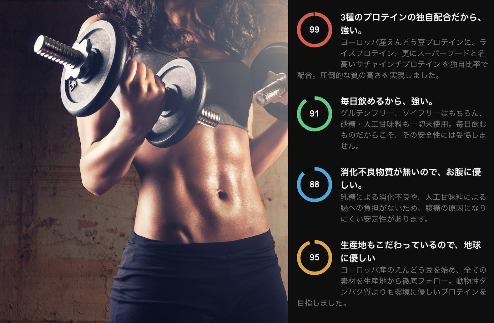ピー(エンドウ豆)プロテインは、筋肉の合成において非常に高い効果がある*とされており、ベジタリアンのボディビルダーや本格的なトレーニー、ヨガの先生や箱根ランナーなど、愛用者は実にさまざまです。アルギニンや鉄がホエイより多く含まれ、抗酸化作用があるため、長距離走やボクシングといった有酸素運動をする方を、より「強く」します。