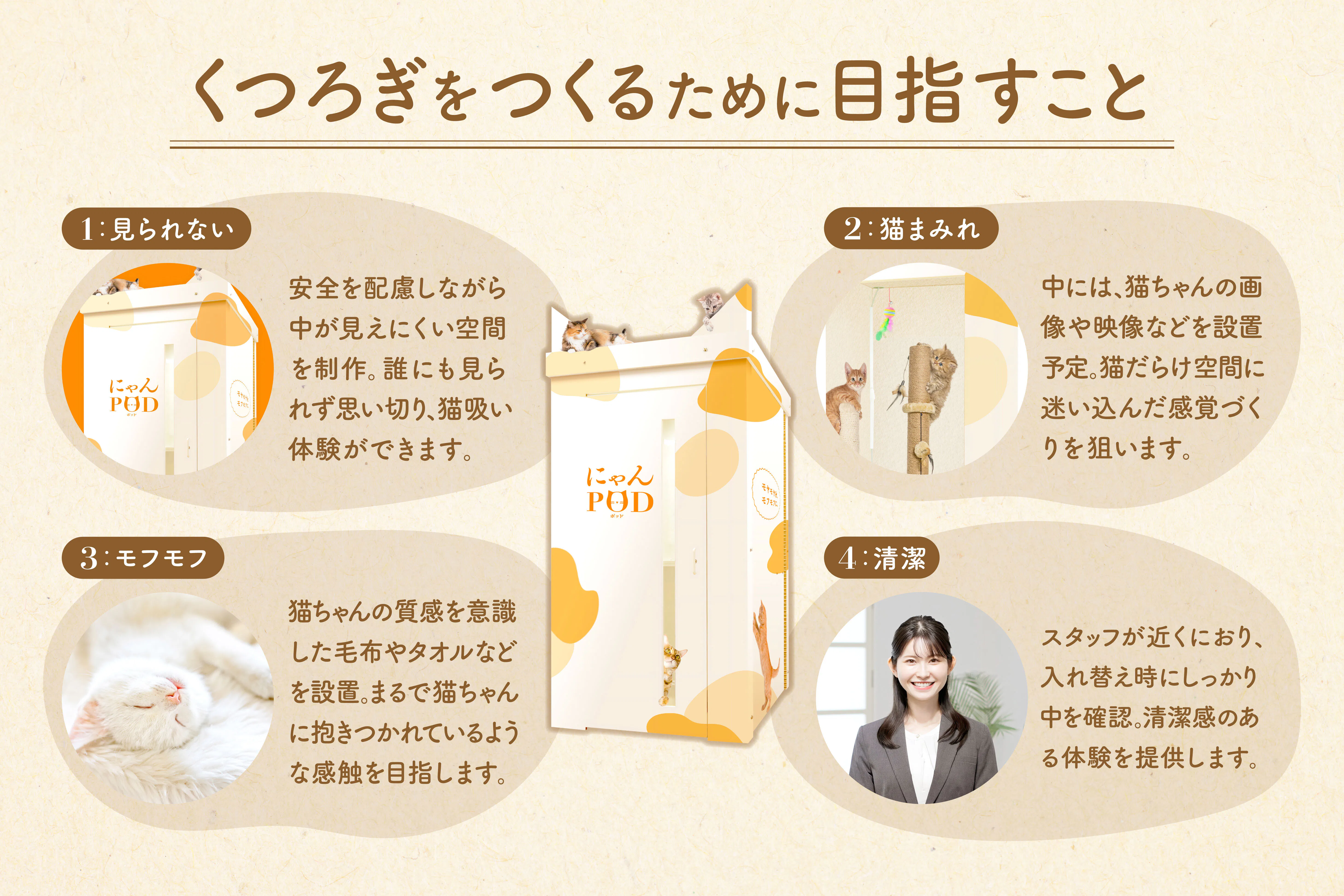 私たちは、「にゃんPOD(ポッド)」という、今までにない新しいリラックス空間をつくりたいと考えています。