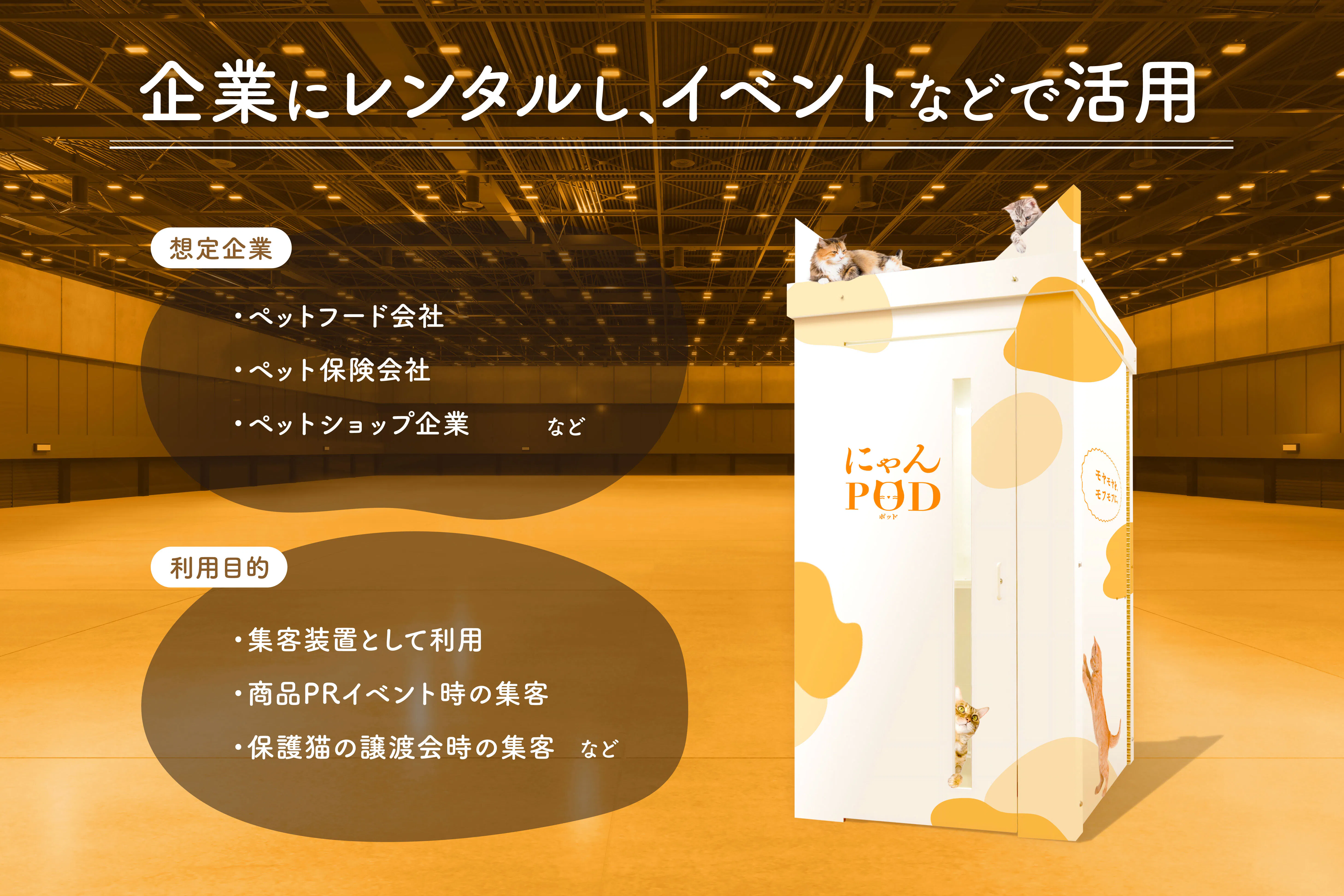 まず最初のステップとしては、にゃんポッドを制作後は、ペットフード会社、ペット保険会社など、さまざまな企業様のイベント時に貸し出し、集客装置として使っていただくことなどを考えています。