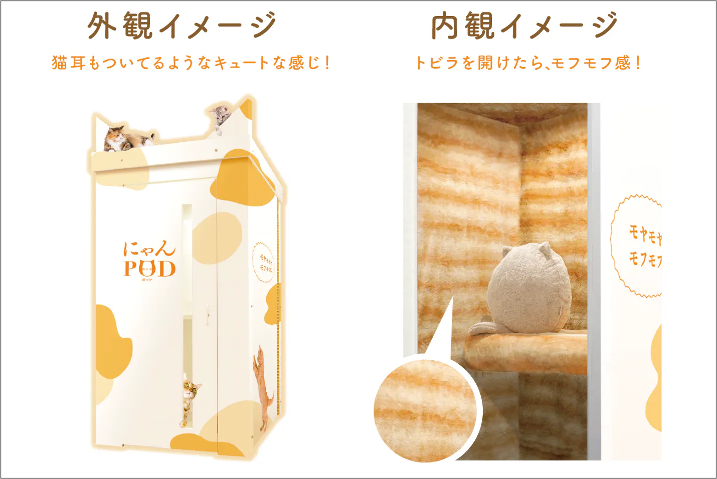 にゃんPODとは、「猫の香り」と「モフモフの幸福感」に包まれ、短時間で心が安らぐ、猫吸い体験ができる箱型の癒し空間、喫煙所ならぬ、喫猫所です。