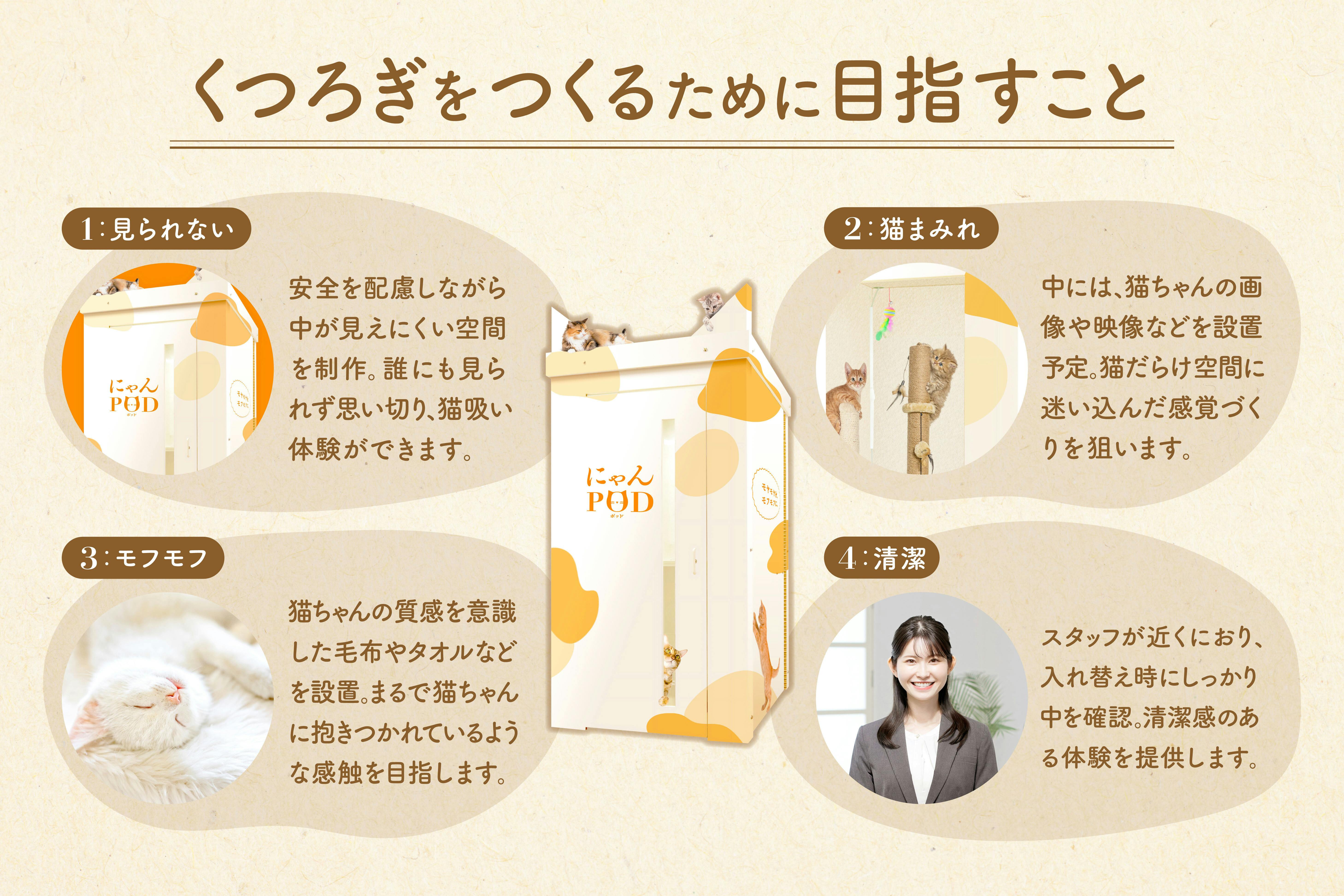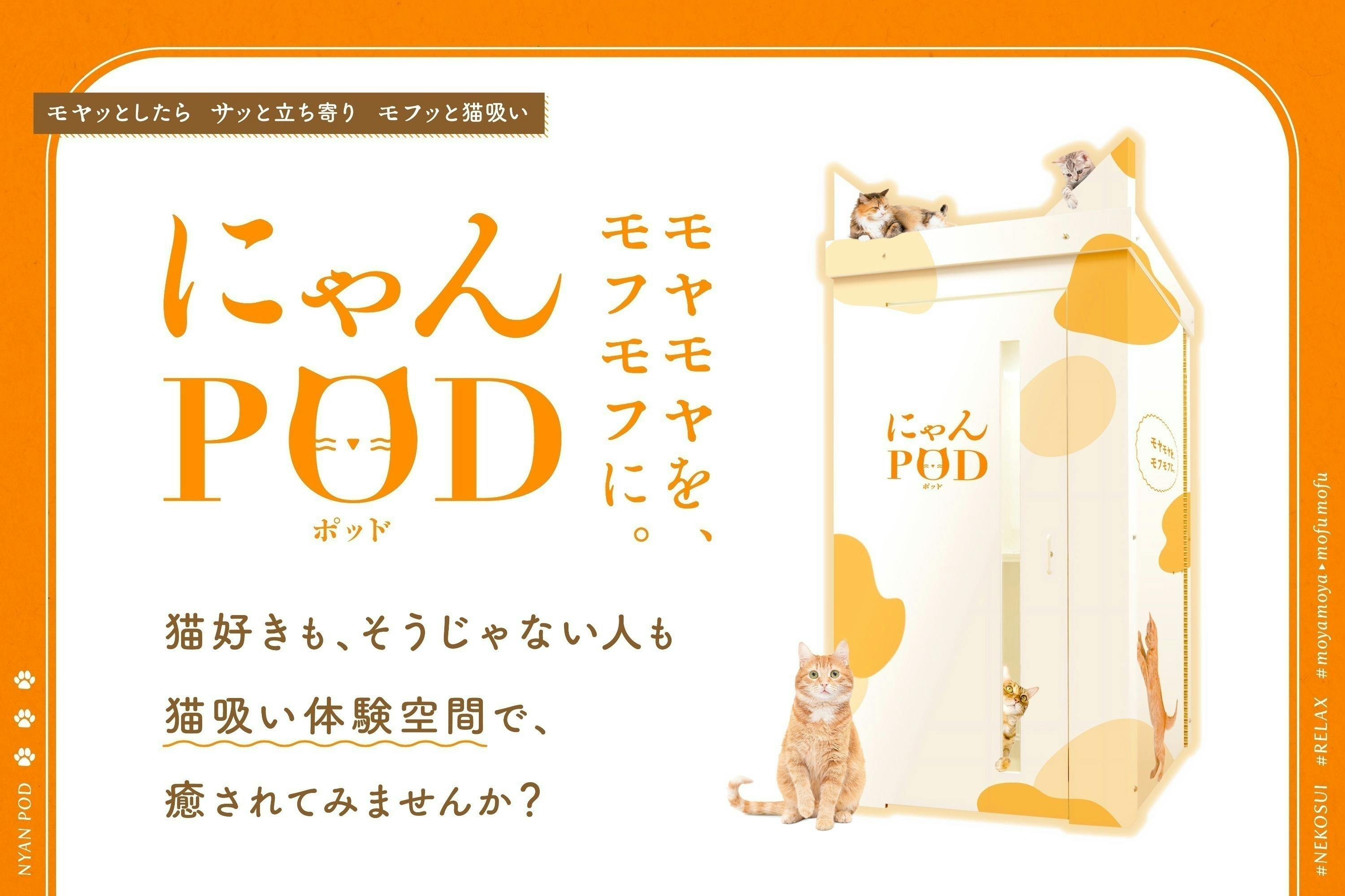 「にゃんPOD」は、忙しい人が短時間で心からリラックスできる、気ままに猫吸い体験空間(喫猫所)です。
