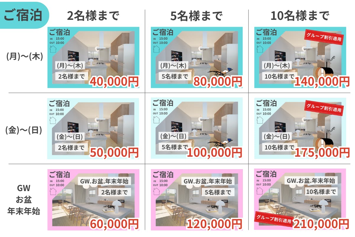 【週末|金〜日・祝前日】~2名:¥50,000/~5名:¥100,000/~10名:¥175,000