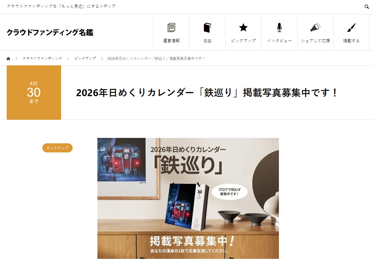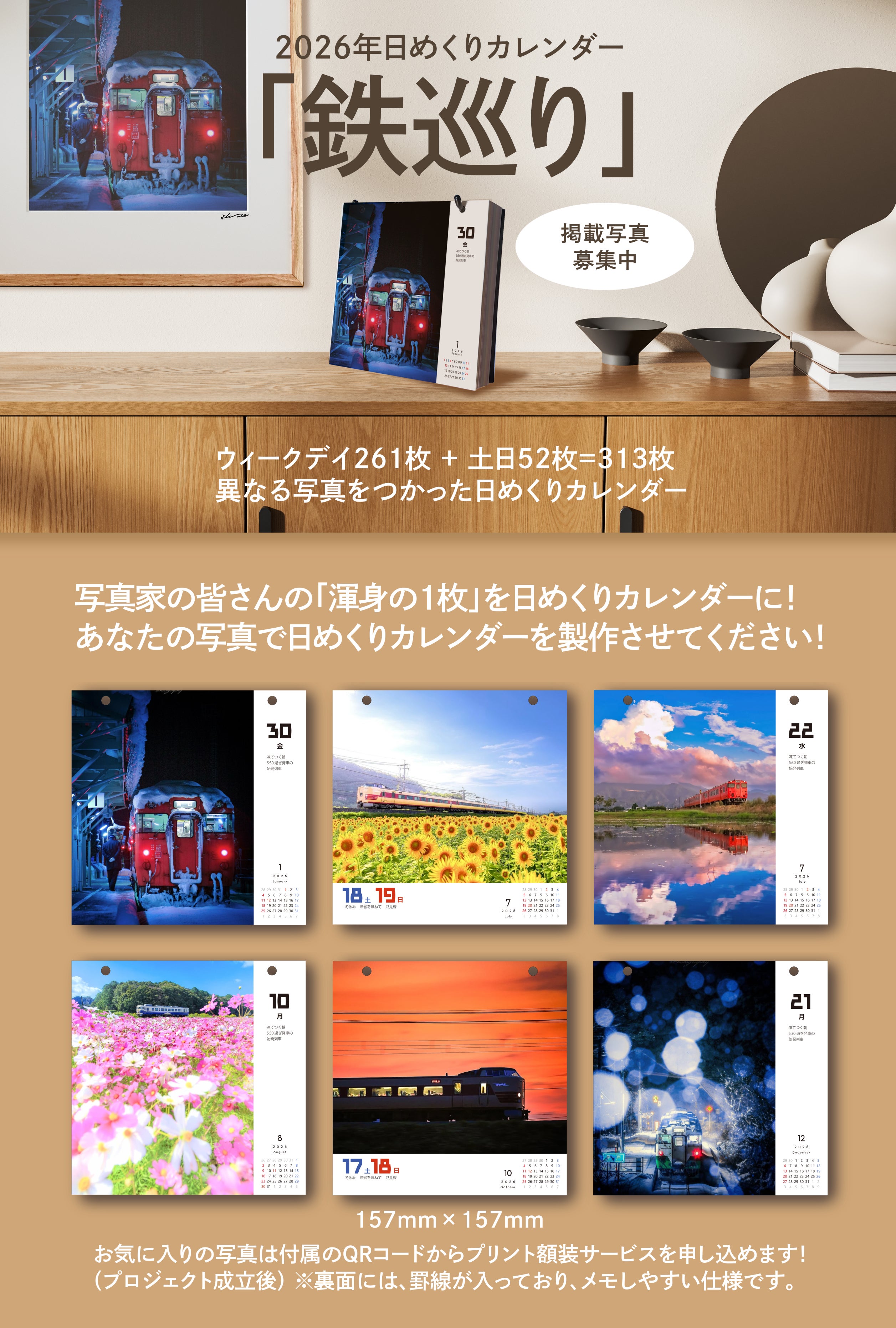 プロジェクト成立後、写真の応募受付(応募フォーム)、2026年日めくりカレンダー「鉄巡り」の販売や「プリント&額装サービス」申込ページなど開設されます。また掲載された作品やおしくも選考から外れた作品のご紹介もおこなってまいります。(2025年10月予定)
