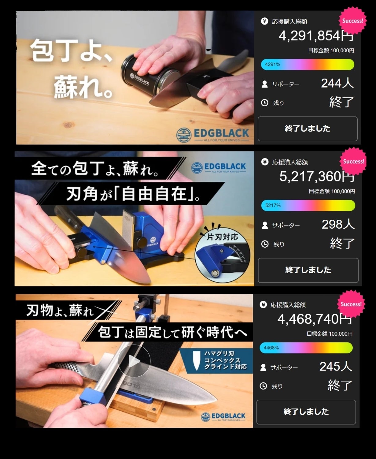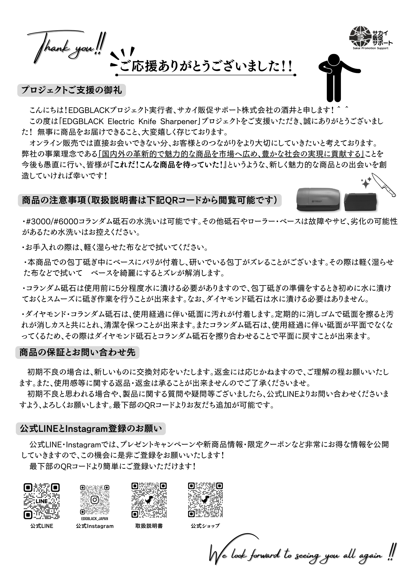 2025/09/01 12:55【EDGBLACK Electric Knife Sharpener プロジェクト支援者の皆さまへ】お世話になっております!サカイ販促サポートの酒井です^^EDGBLACK Electric Knife Sharpenerの応援購入いただいた支援者の皆さま、大変お待たせいたしました!本日全てのサポーター様へリターン商品を発送いたします!早い方は明日より、順次お手元に届きますので暫くお待ちいただけますと幸いです^^地域によっては届くまでにお時間がかかってしまう可能性もございますのでご了承ください。何かご不明点やお困りの点がありましたら、お気軽に弊社公式LINEまでご連絡くださいませ!上手く包丁が砥げないということなどございましたら、何でもご相談ください。■公式LINE: https://lin.ee/XAdlXY9取扱説明書に関しまして、皆さまがネットから簡単にご確認いただけるようにダウンロード用の取扱説明書をご用意させていただきました!印刷してご利用いただくことも可能です!勿論、簡単ではございますが商品にも取扱説明書は同梱しておりますので、ご安心くださいませ。↓URLは以下の通りです。https://drive.google.com/file/d/1Zk27Kqc_u_Uma_wRdCHu-P4VmO1wrD1u/view?usp=sharing皆さまの手元に「EDGBLACK Electric Knife Sharpener」が無事に届き、愛用の包丁やナイフを砥ぎあげ、鋭くなった切れ味を料理や趣味の中で体感している姿を想像すると、非常に胸が熱くなる想いでございます...!!是非、知人やSNSなどで未だ本商品を知らない方へこんなに良い包丁研ぎがあるんだということを是非お知らせいただけますと幸いです^^これからも『国内外の革新的で魅力的な商品を市場へ広め、豊かな社会の実現に貢献する』という事業理念のもと、益々尽力してまいります!今後とも温かいご支援とご愛顧を賜れますよう、心よりお願い申し上げます^^ もっと見る【ご報告とお願い】リターン生産・配送状況とお届け先住所確定について