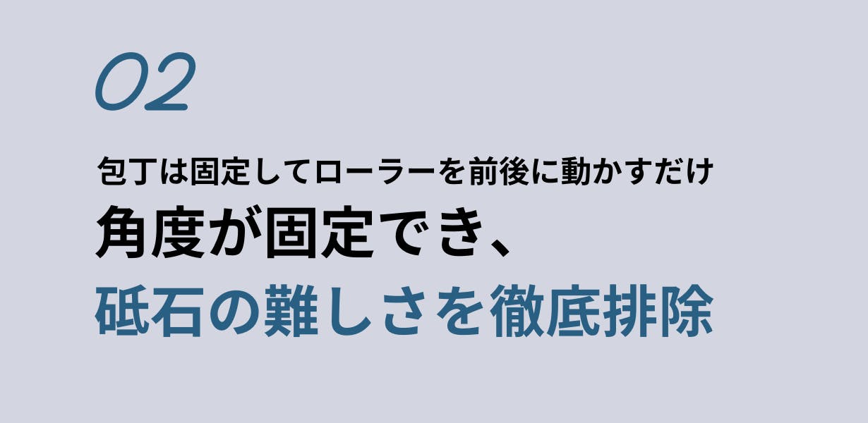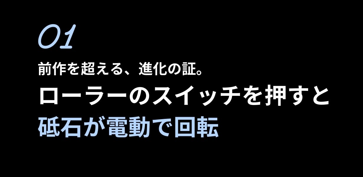 本商品は転がす砥石という従来の形を踏襲しながらもその砥石を電動で回転させる事で更なる効率化・砥ぎの質向上を実現しました。