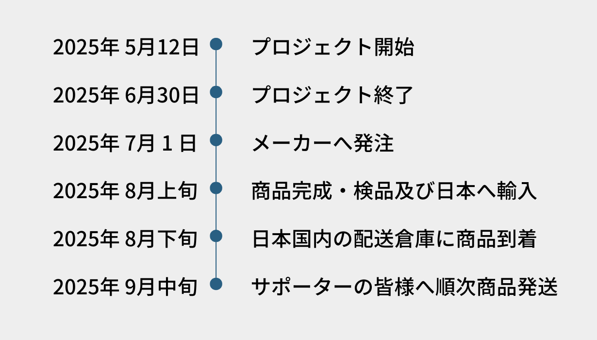 ※本文中に記載させていただいたスケジュールは、あくまでプロジェクト公開時点の予定です。クラウドファンディングの性質上、配送遅延のおそれがございます。原則として、配送遅延に伴うご支援のキャンセルはできませんが、リターン配送予定月から3ヶ月を超えた場合には、希望者に限りキャンセルにて対応させていただきます。