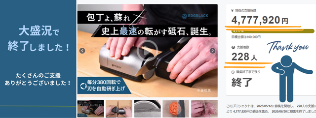 2025/07/02 12:00EDGBLACKプロジェクトをご支援いただいた皆さまへお世話になっております。プロジェクト担当です。「EDGBLACK Electric Knife Sharpener」のプロジェクトは、2025年6月30日をもちまして無事終了いたしました!結果として、総支援額:4,777,920円/支援者数:228名という素晴らしい成果をいただきました。ここまで応援してくださった皆さまに、心より感謝申し上げます!!ご支援、本当にありがとうございました!配送につきましては、これから予定通り、それ以上のペースで配送ができるよう、全力で準備を進めてまいります!現時点での発送開始は9月中旬~を予定しております。進捗は、随時活動レポートを通じて皆さまにお知らせさせていただきます。尚、お届け先のご住所が変更となる場合は、事前にcampfireの管理画面にてご変更ください。出荷準備が完了しますとお届け先の変更ができなくなりますので、お早めに対応をお願いできますと幸いです!さて、プロジェクトの終了は一つの節目ではありますが、これからも高品質な製品とサービスを提供するため、一層の努力を重ねてまいります!尚、今後の一般販売や新規プロジェクトについては公式LINEで告知いたしますので、この機会にお友だち追加をいただけますと幸いです!!▼公式LINEhttps://lin.ee/2FQj6xV今後とも変わらぬご支援とご愛顧を賜りますよう、よろしくお願い申し上げます!!^^感謝の気持ちを込めてEDGBLACKプロジェクト担当 もっと見る