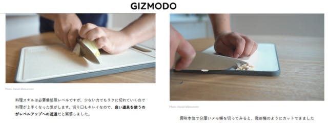 記事内では、玉ねぎや紙をスパッと切るデモも掲載されており、
