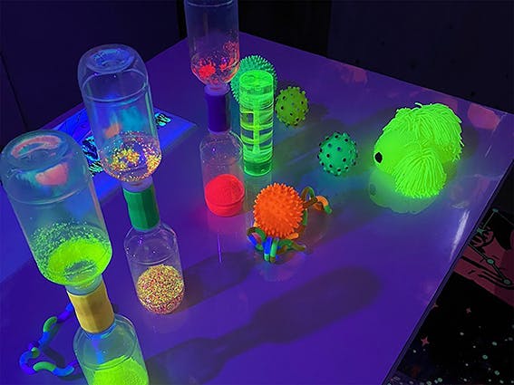スヌーズレンブラックライトルームには、お子さんが実際に触れて遊べるオモチャもあります。それぞれのお子さんの好みに合わせて「トゲトゲした硬いボール」や「柔らかくふわふわしたもの」や「ぷにゅぷにゅした不思議な感覚」「ゆっくりじわっと動くおもちゃ」など、お子さんが興味を持つ光るおもちゃで遊んでください!