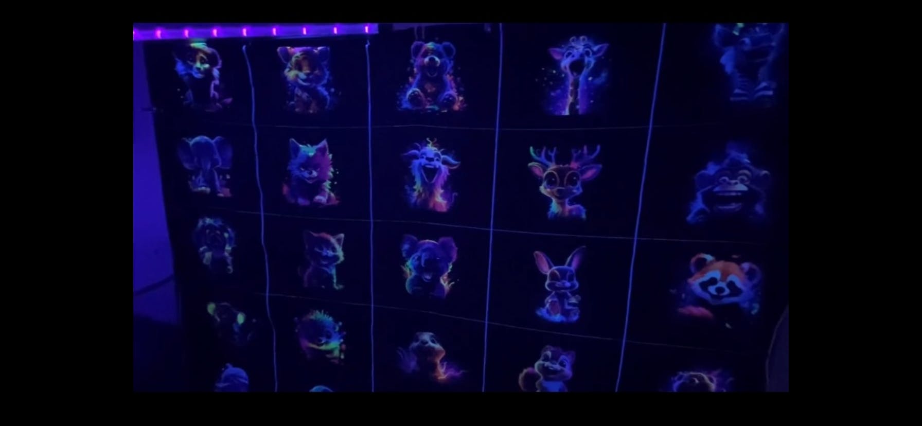 ブラックライトを照射すると鮮やかに発光する柔らかい素材で制作した150㎝×200㎝のオリジナルデザインのアートシートをお送りします。ご自宅や店舗の壁などに貼ることで手軽に「スヌーズレンブラックライトルーム」を体験できます。またお礼メッセージでご支援にお応えすることも行っています。