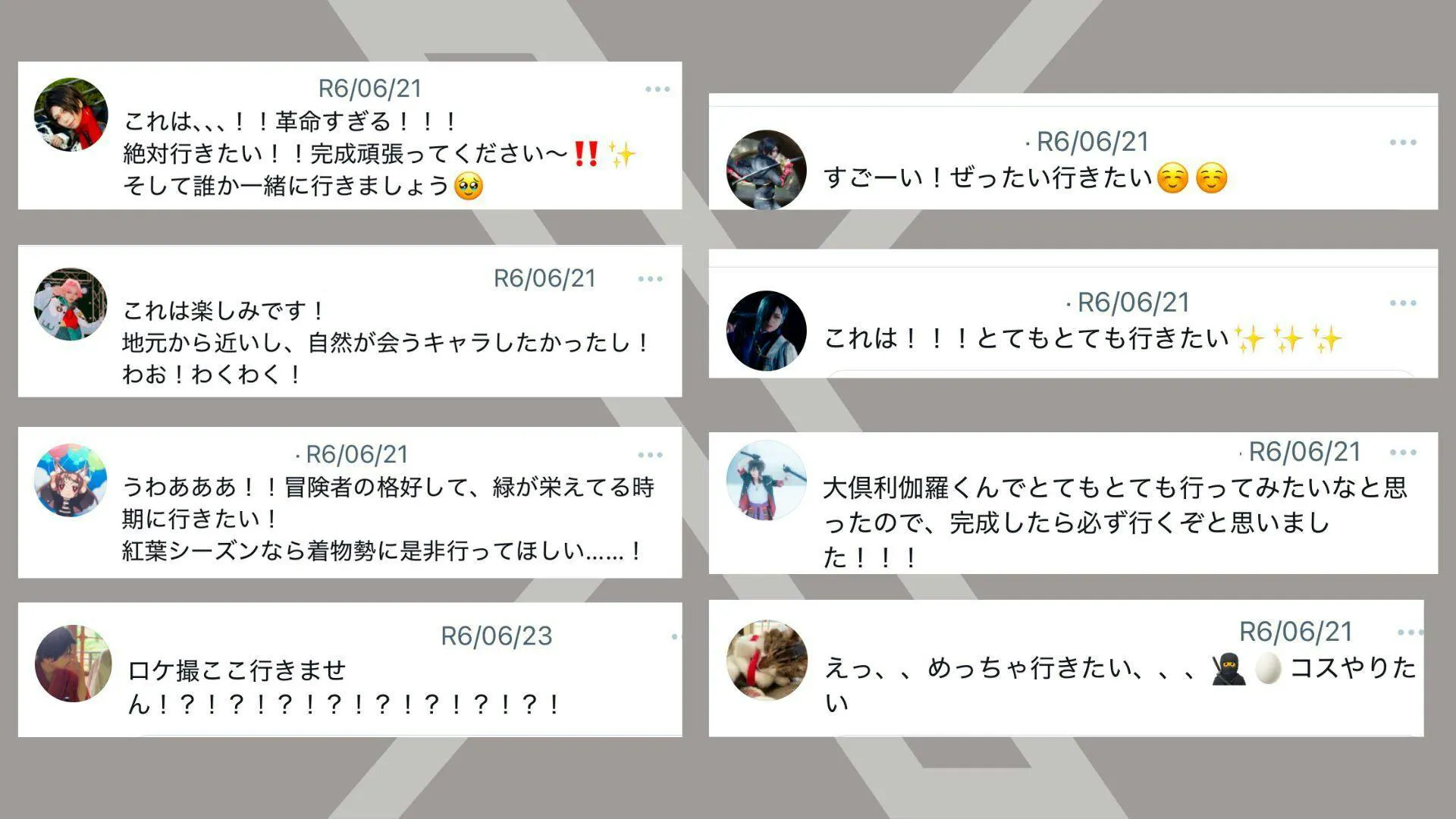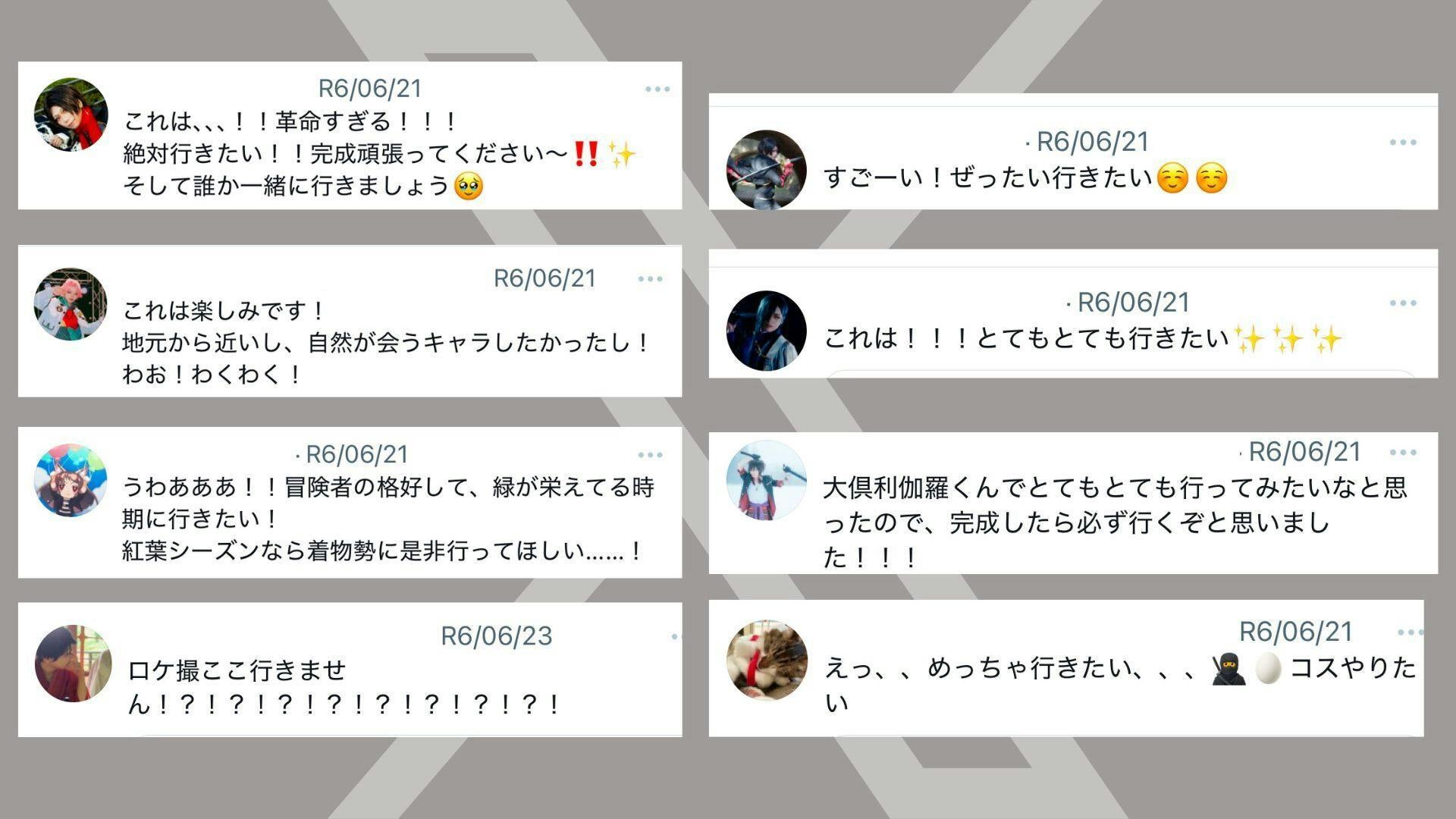 すると、750件ほどのコメントが届いたのです。すごい、革命的すぎる。絶対絶対行きたい。そんな風なコメントを送ってくださったのは、日本全国のコスプレイヤーたちに、彼女、彼らは森や神社で撮影がしたい、でもどこに許可を取ったらいいのかわからない、許可を取るのが大変だ、そんな風な課題を抱えていました。