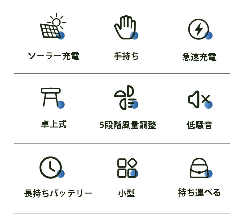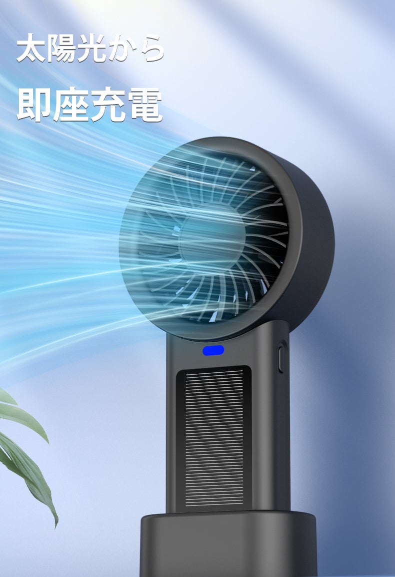 また、太陽光で自動充電ができるため、屋外や災害時など、電源が不安定な状況でも安心。どこでも、どんな状況でも涼しい風をお届けします。