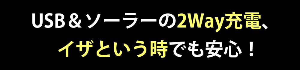 キャンプやハイキング中でも、太陽光でしっかり充電できます。また、USB充電にも対応しているため、室内や曇りの日でも安心。普段使いはもちろん、アウトドアや災害時など、あらゆるシーンで頼れる一台です。