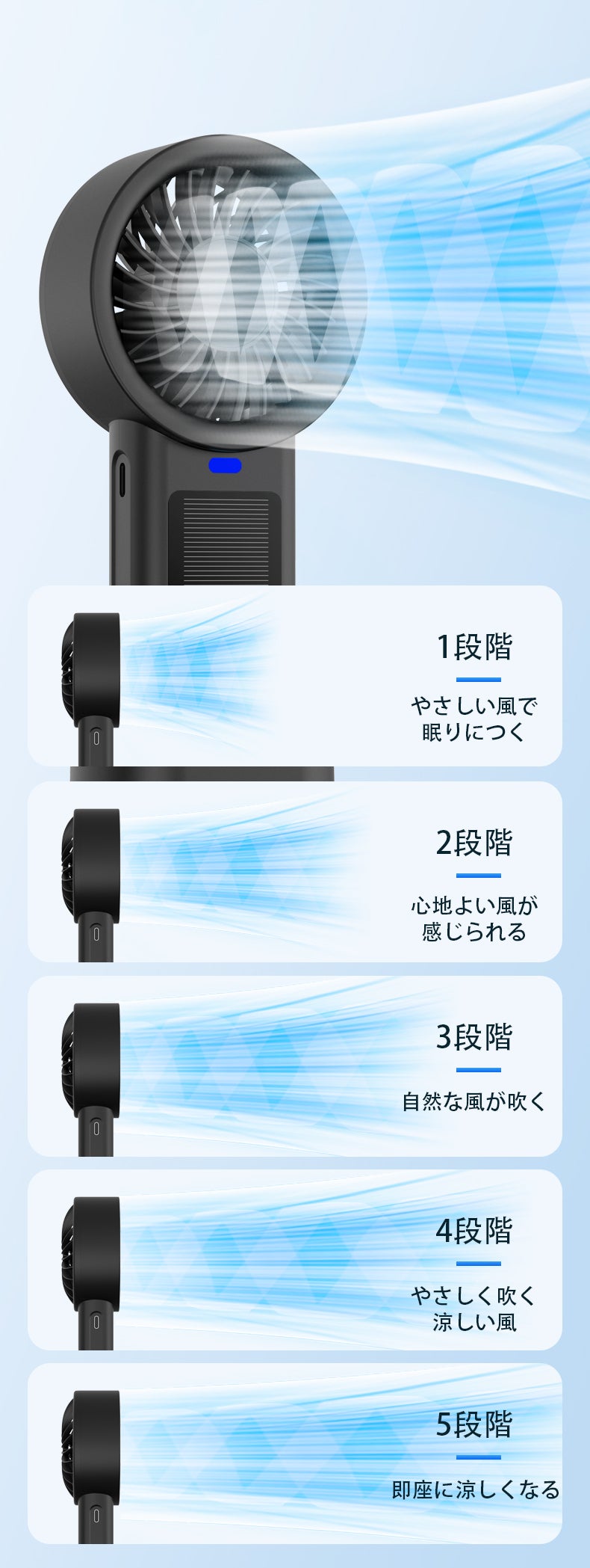 ボタンひとつで5段階の風量調節が可能(弱~強モード)、優しいそよ風のような心地よさから、強力な風まで、シーンに合わせて自在に切り替えられます。どんな時でも、理想的な風をお届けします。