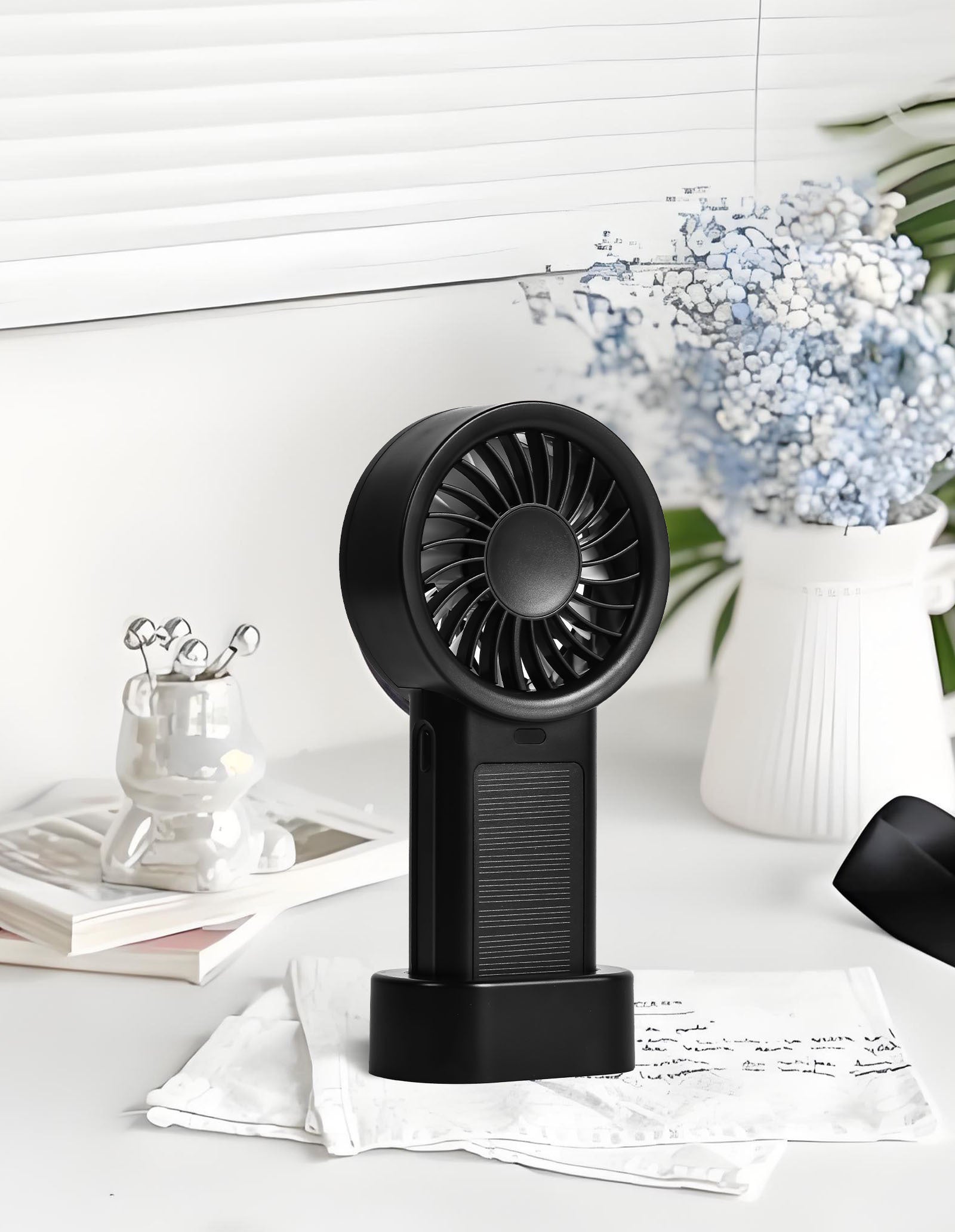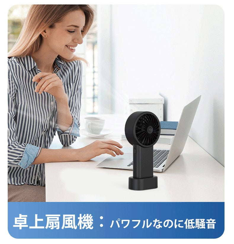 軽量でコンパクトなデザインで、手持ちでの使用はもちろん、専用スタンドで卓上扇風機としても活躍。