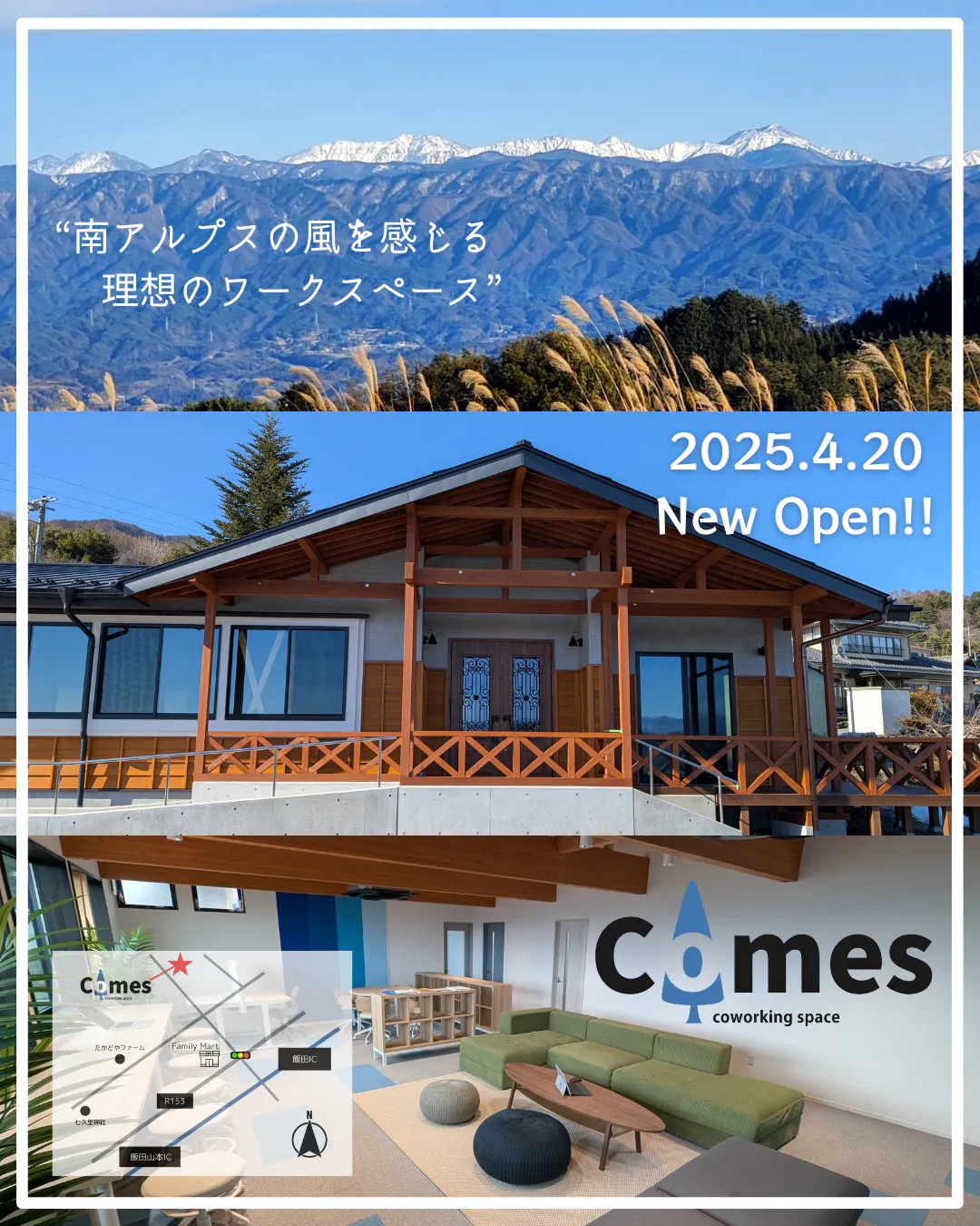 長年ご縁のあった企業様から土地を譲り受け、コワーキングスペースを飯田市に立ち上げる運びとなりました。この場所を通じて、同じようなご縁や新たなつながりが「Comes」で生まれることを願っています。