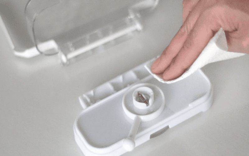 従来商品だと上部と底部を取り外しが出来ず、飛び散った水や食べ残しの液体がロックレバーの隙間に入り込み、さらに固まって手入れが出来ない状態でした。お家にあるごく普通のドライバーを使ってメンテンナスを行う事が可能です。