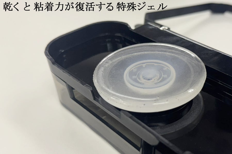 水で洗い流しても自然乾燥やドライヤーで乾かすと粘着力が戻るジェルを使用しております。粘着×吸盤で固定力UP致しました。ロックレバーを引くと簡単に剥がす事も出来ます。貼る→剥がす→洗う→貼るのループ使用!
