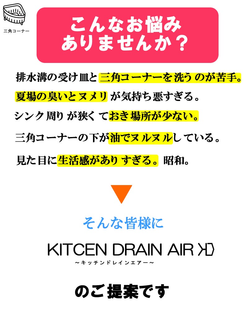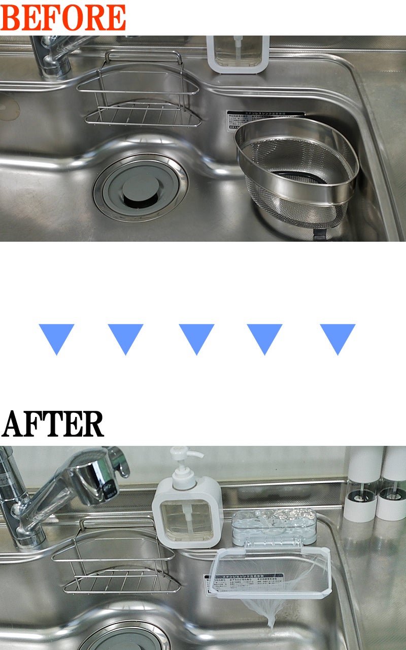 当たり前だと思っていた掃除時間のロスに気づく事が出来ます。また夏場三角コーナーの網目に詰まった生ごみの臭いから解消された事に気づいて頂けます。