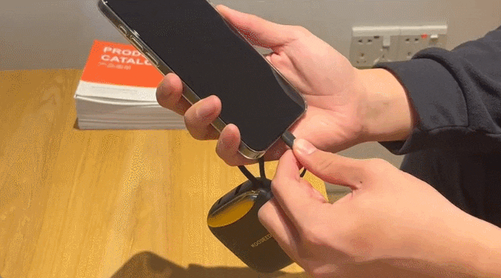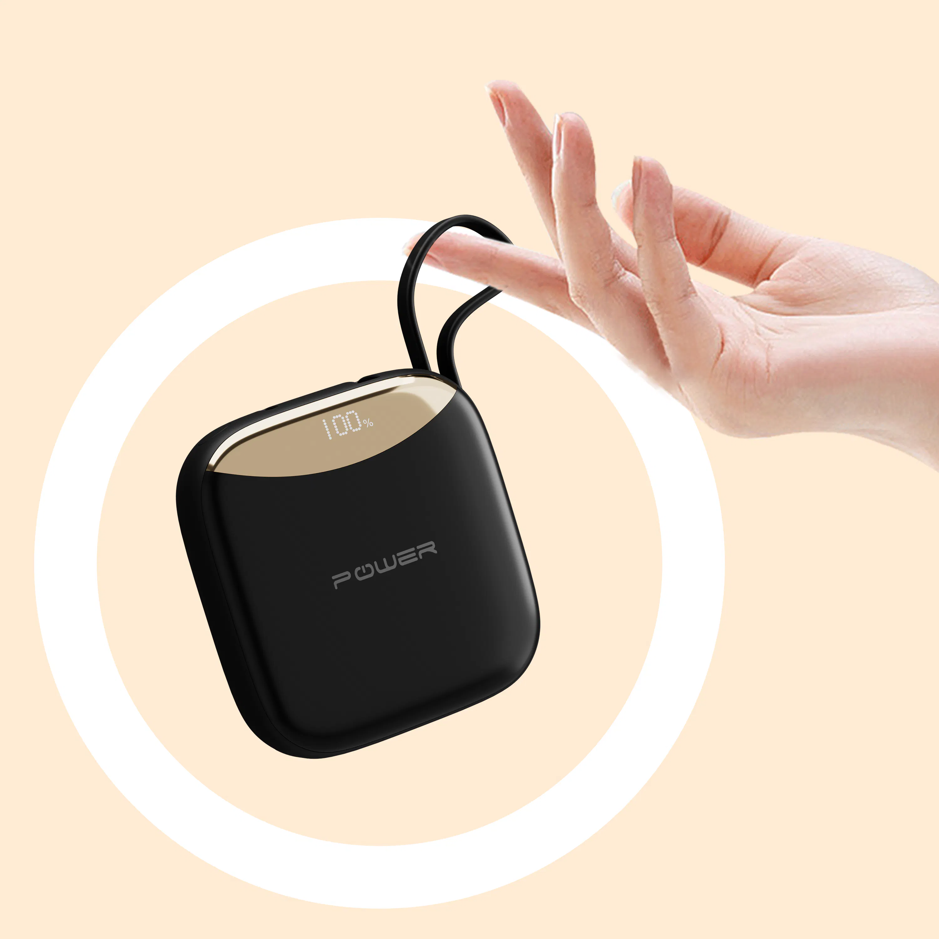 POWER BANK mini は充電用のケーブルをストラップ代わりにして、指にぶら下げながらスマホの充電ができます。