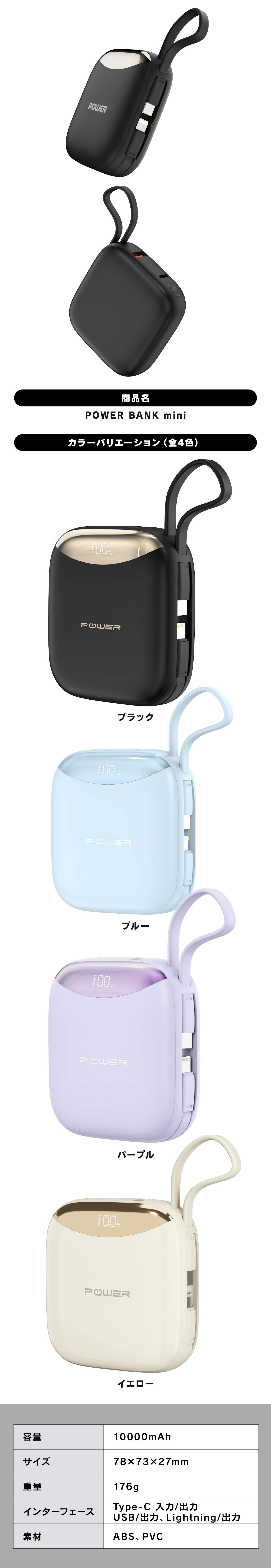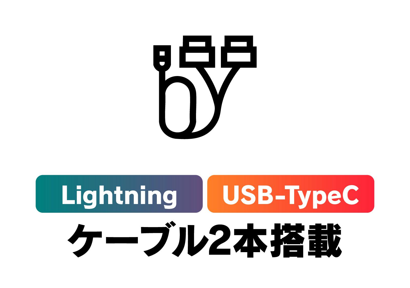 POWER BANK mini は、iPhone用のLightning ケーブル と Android用のUSB-TypeCの2本のケーブルを本体に搭載。