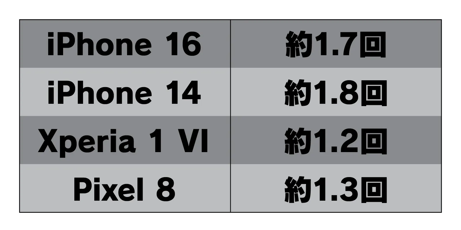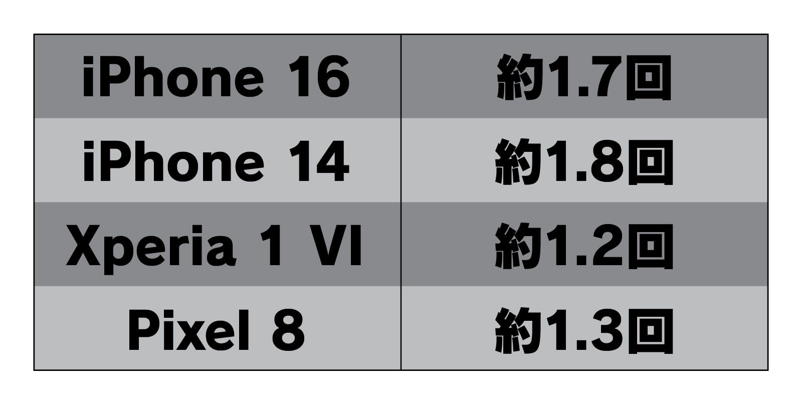 iPhne12で約2回、iPhne14で約1.8回、iPhne16で約1.7回、大容量バッテリーが売りのXperia 1 VIでも1.2回でフル充電が可能。