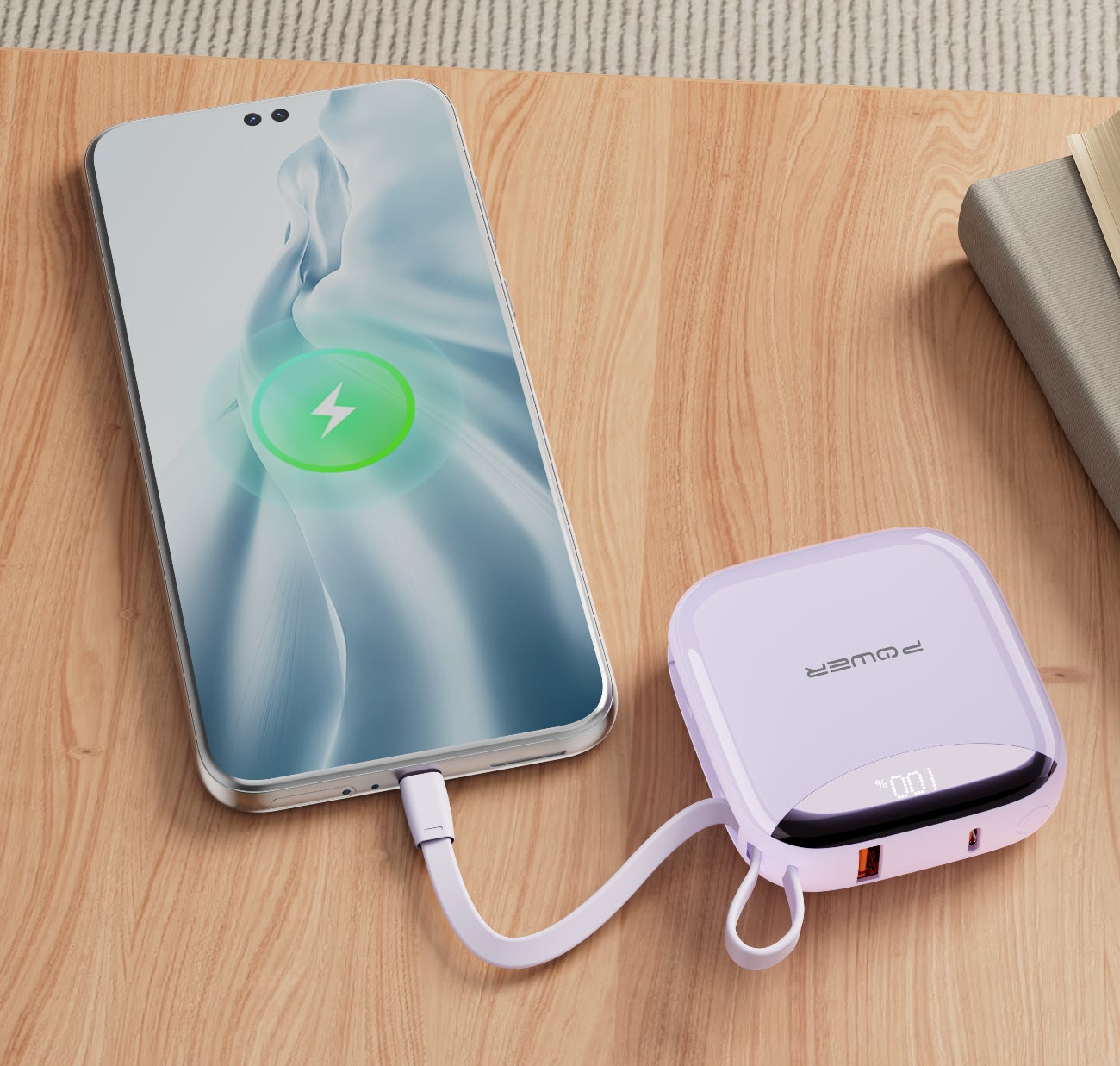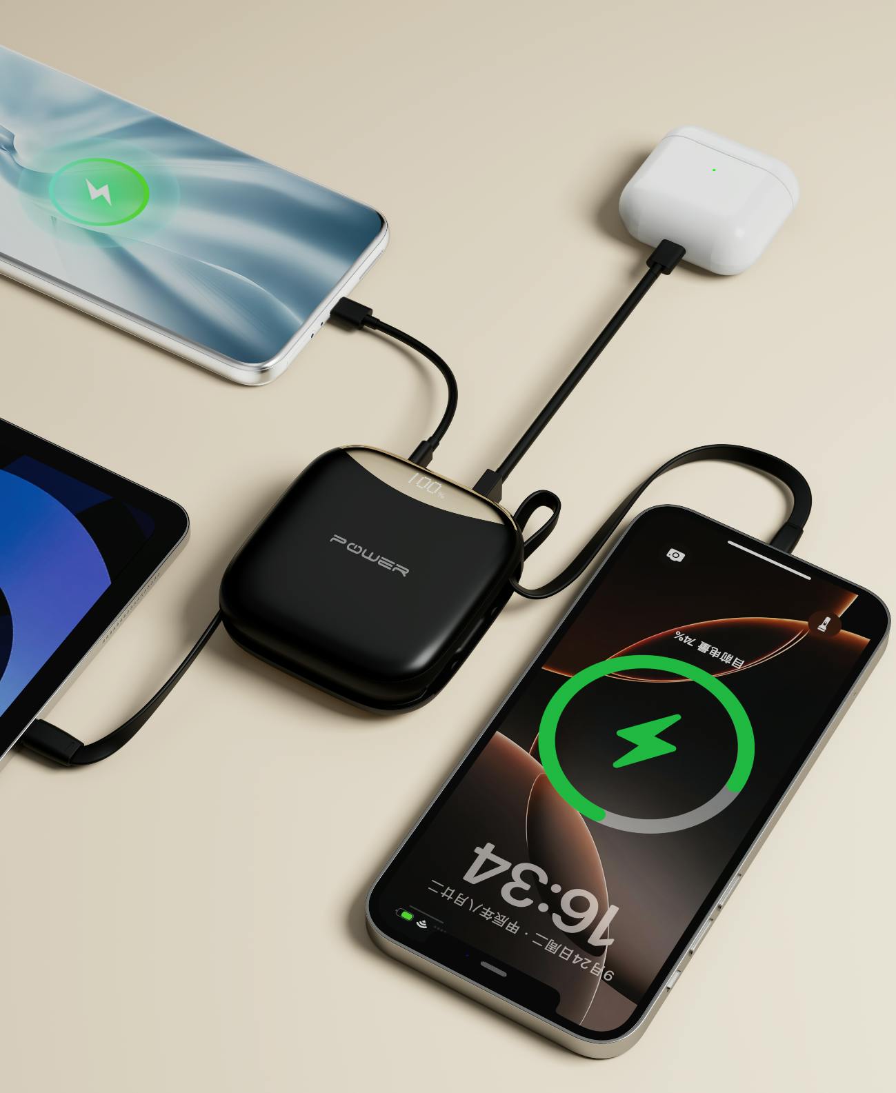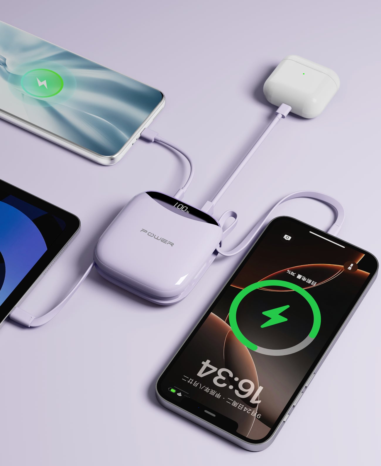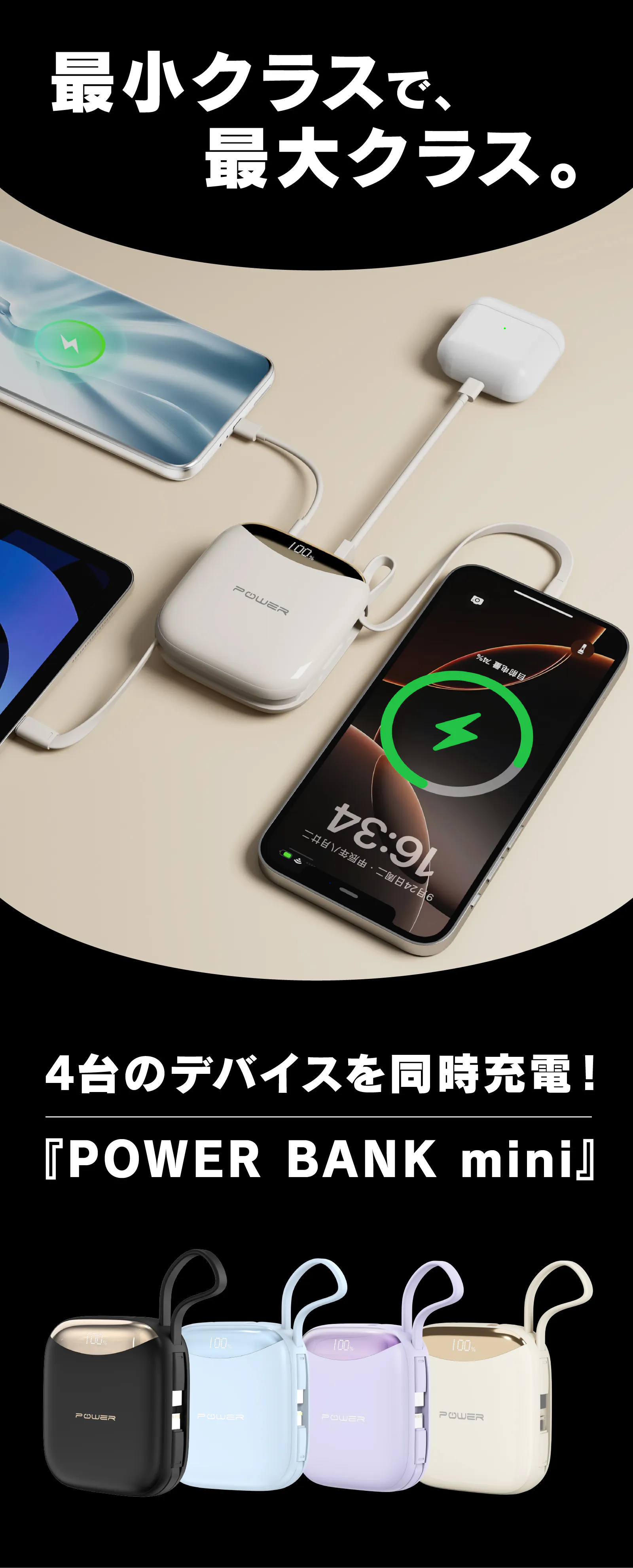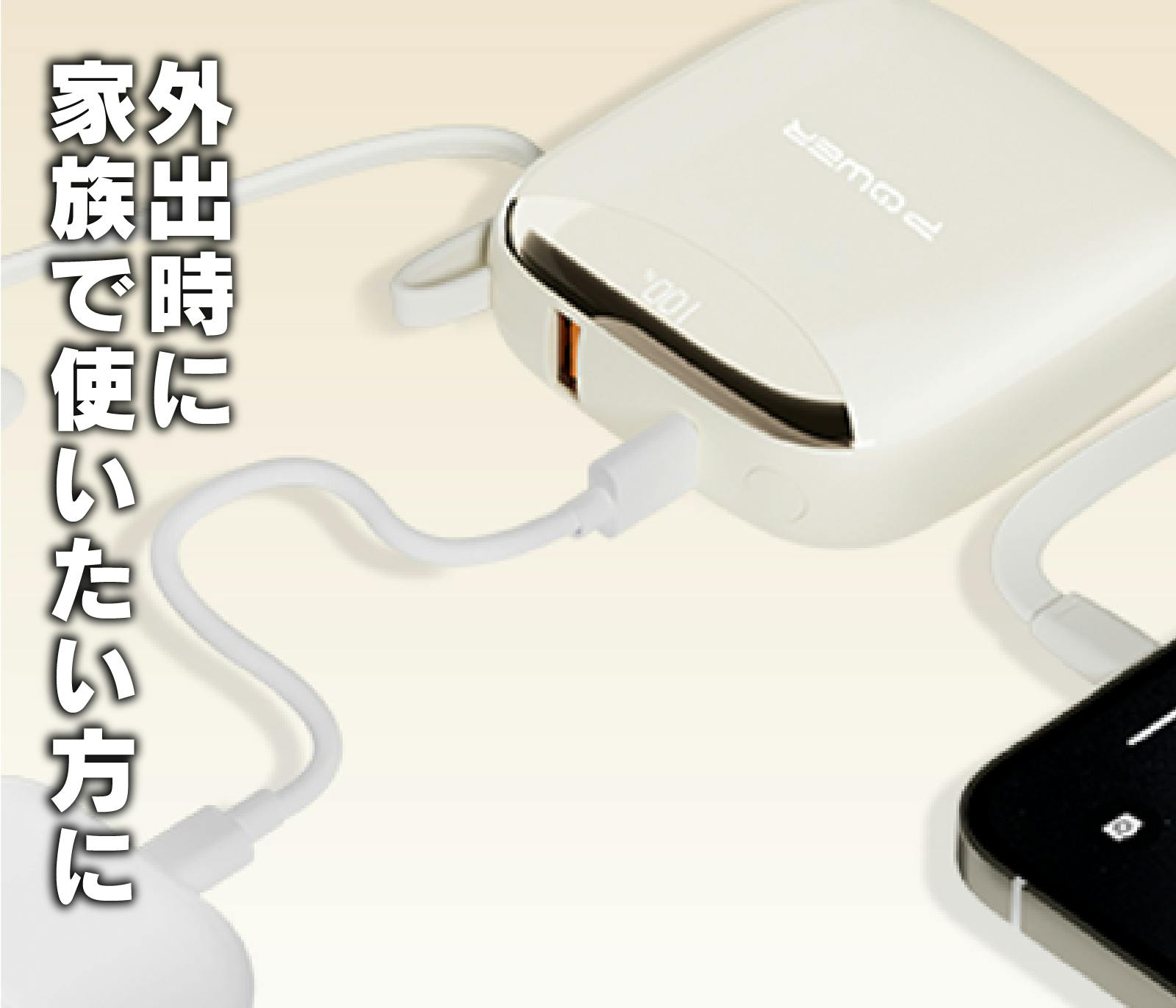 iPhone、Android両タイプのスマホに対応する2本のケーブルを搭載し、タブレットやワイヤレスイヤホン、ゲーム機など最大4台のデバイスに同時充電が可能。