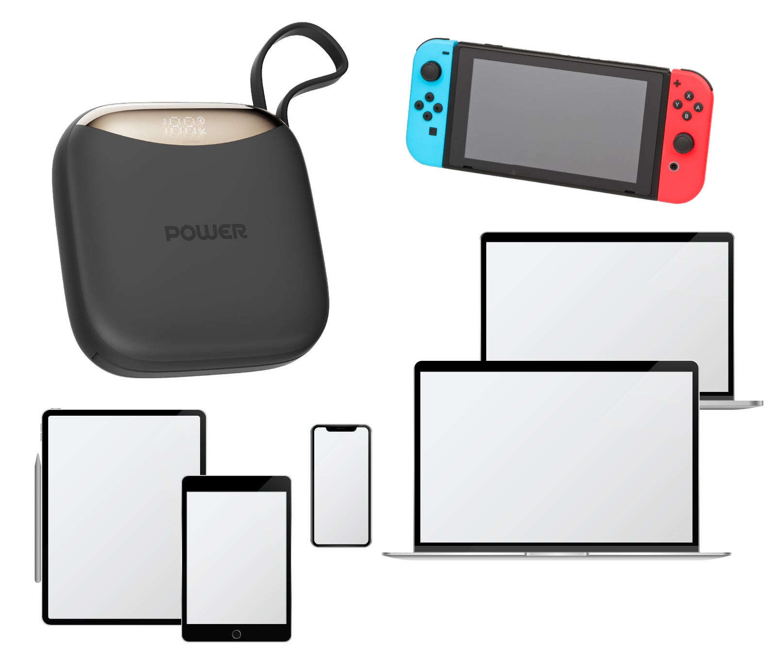 →本製品は、スマートフォン、タブレット、ノートPCなど幅広いデバイスに対応しています。Type-C、USB、Micro USB、Appleインターフェースを搭載しているため、多くのデバイスを1台で充電可能です。