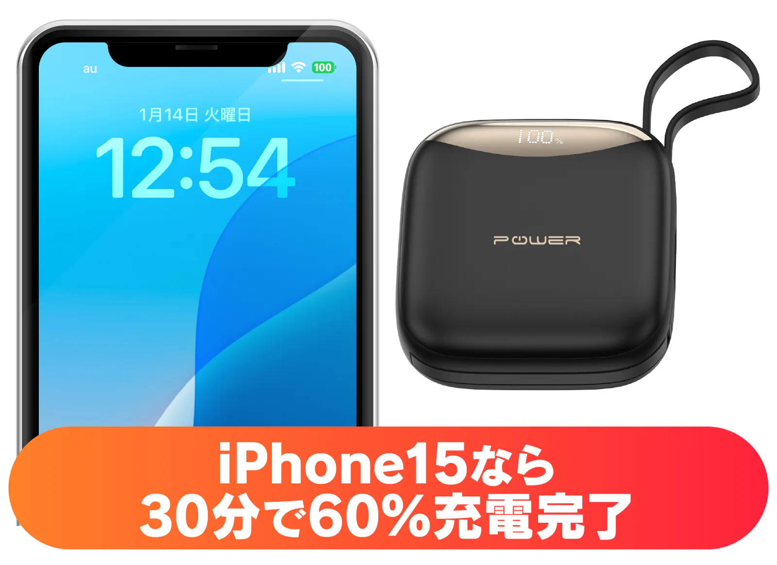 例えばバッテリー切れを起こしたiPhne15ならたった30分で60%まで回復。