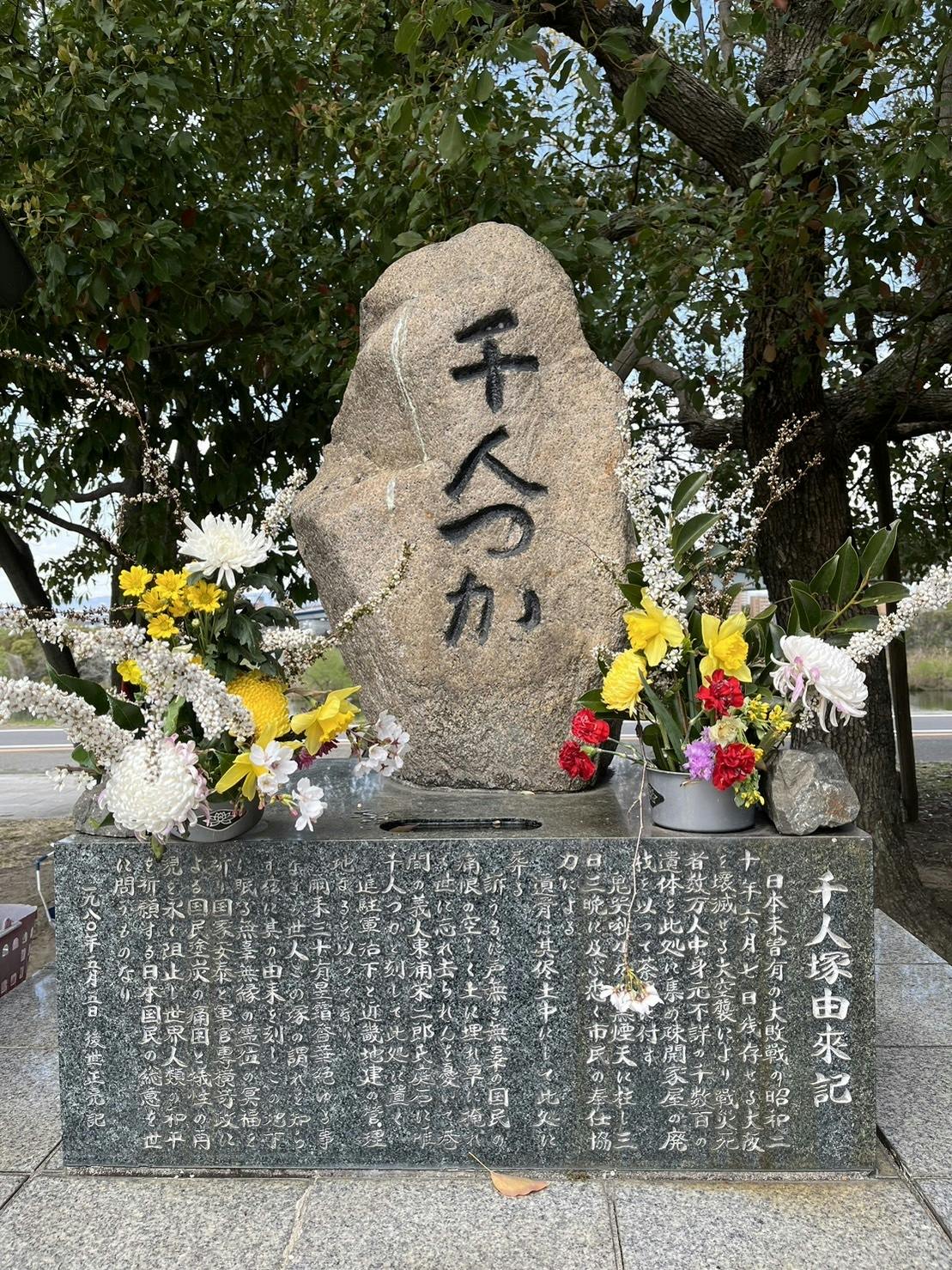この状況を憂えた地域住民の有志たちが、自主的に、城北公園に遺体を収容し、疎開家屋の廃材などを用いて荼毘に付し、そのまま埋葬しました。すべての遺体を処理するのに、3日間かかりました。翌年、住民のひとり、東浦栄二郎さんが、その焼け跡に土を盛り、自宅の庭にあった岩に「千人つか」と彫りつけて小さな塚を築き、犠牲者の冥福を祈りました。これが「千人塚」です。