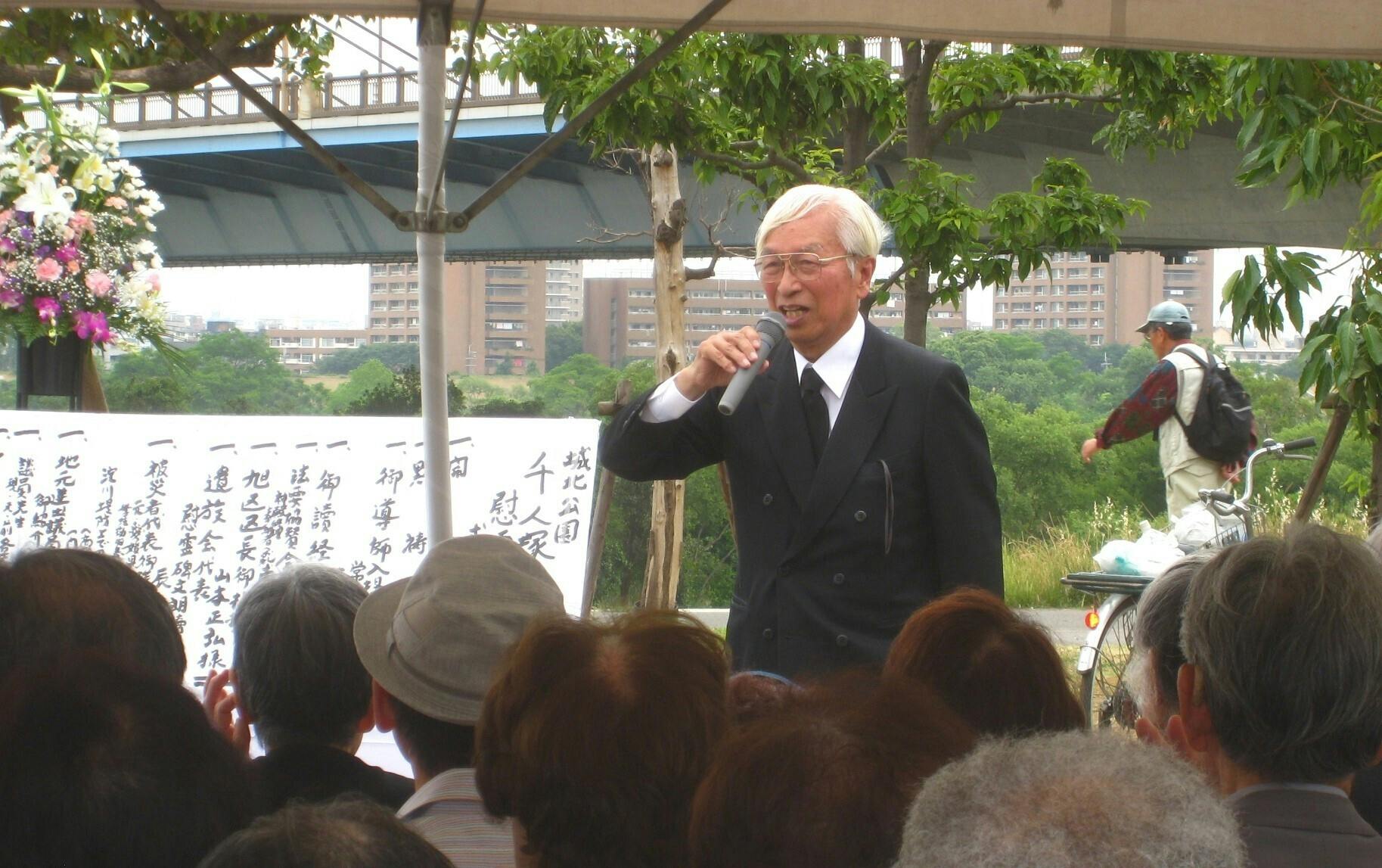 NPO法人フェリスモンテ理事・事務局長の隅田耕史と申します。私たちは、地域に根差した助け合いの活動に取り組む中で、毎年、第三次大阪大空襲のあった6月7日に犠牲者を鎮魂する「千人塚慰霊法要」を営んでこられた東浦栄一氏を紹介されました。
