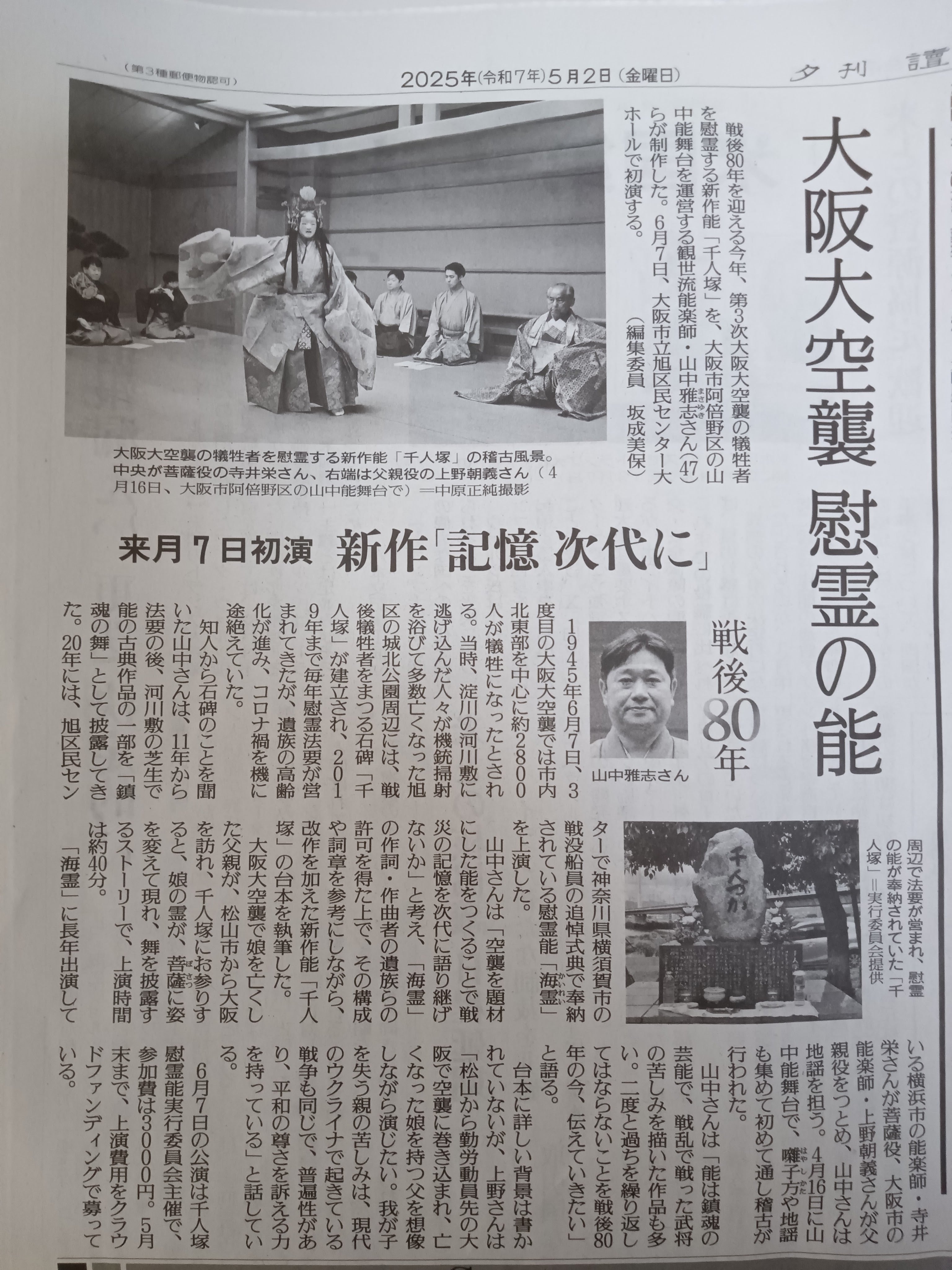 「広報あさひ5月号」にご掲載いただいていました。https://www.city.osaka.lg.jp/asahi/cmsfiles/contents/0000652/652567/03.pdfなんと!「しょうぶちゃん」が能を舞っている特製のイラスト仕様です!!https://www.city.osaka.lg.jp/asahi/page/0000192230.html(しょうぶちゃんについて)各地にゆるキャラは数多いますが、能イベントに合わせて、能仕様になったゆるキャラはかつて存在したことがあったのでしょうか。旭区の広報の方すごいですね!しょうぶちゃんの中に入って、こども向けイベントに参加したこともある私にとってはとても感慨深いです。とてもかわいいので、これからも何かに活かしていきたいです。(このしょうぶちゃんの素材データもほしいですね)みなさま、あらためて応援のほどよろしくお願い申し上げます。