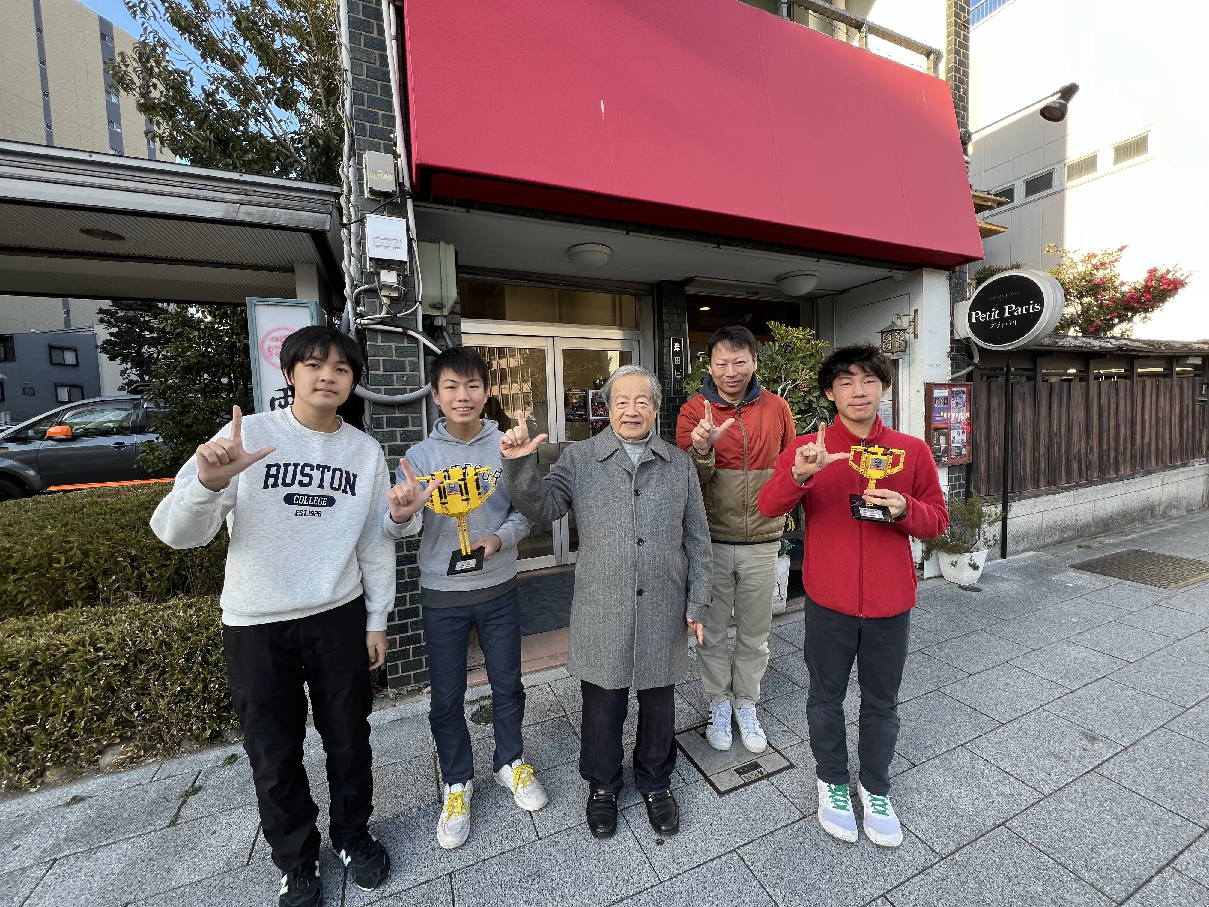 練習場所(通称:ロボ研)を提供してくださっている岸田様(OB)と岸田ビル前にて
