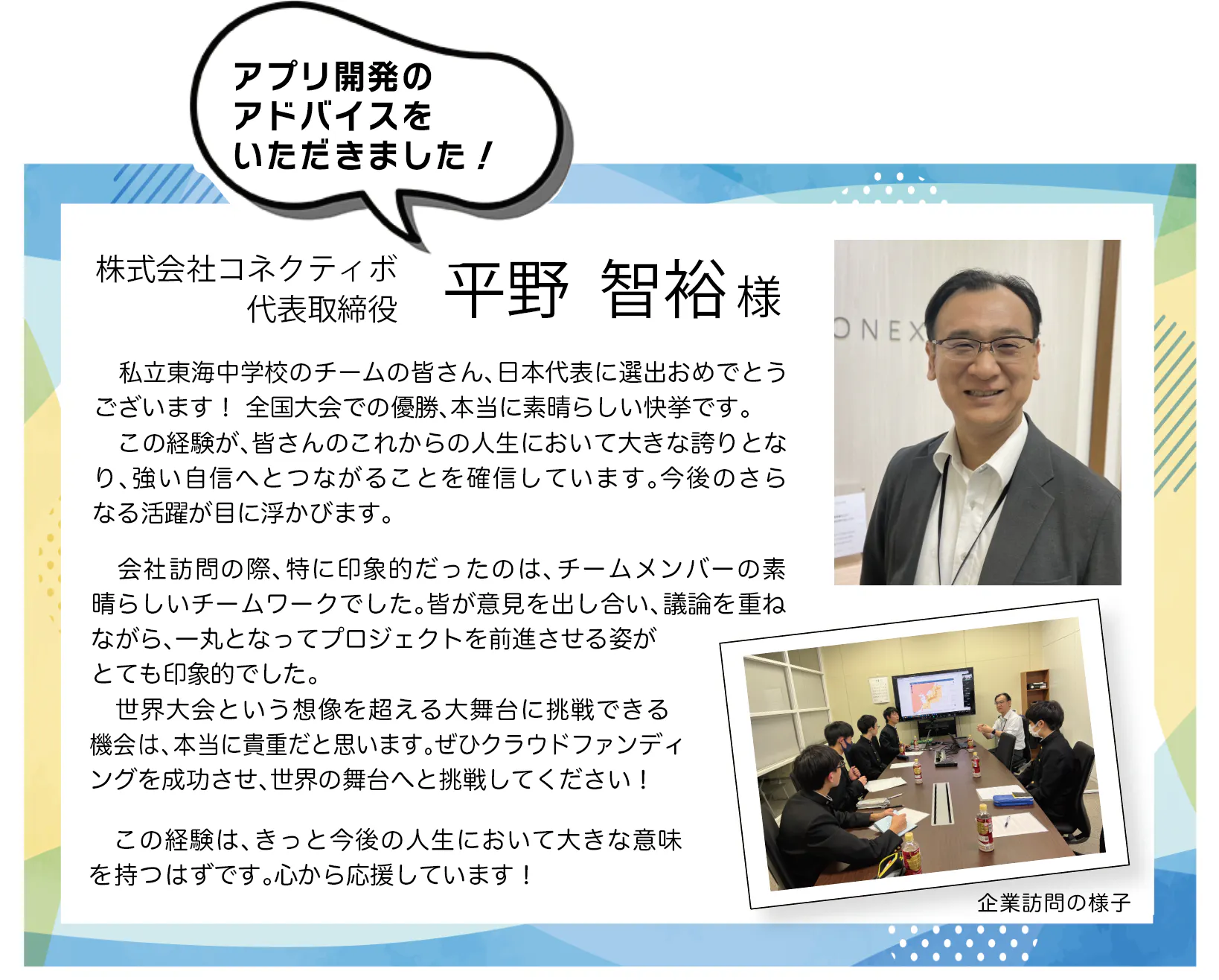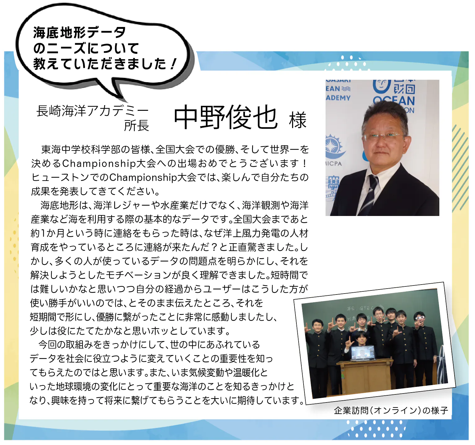 そして初めて出場した地区予選、全国大会では、これまでの努力が実を結びました。僕たちは、学校の先生や保護者、OB、企業、そして地域の皆さんに支えられながら、このプロジェクトを成長させてきました。僕たちにとって、とても満足感のある活動になっています。