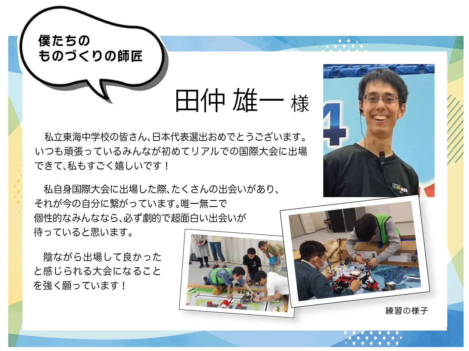 僕たちは日本代表チームとして、世界大会で他の国の代表チームと交流できるように、いろいろ準備をしています。例えば、ロボットの改良をしたり、プレゼンを英語にしたり、交流グッズやオリジナルコスチュームについても考えています。日本らしさを考える良い機会になっています。